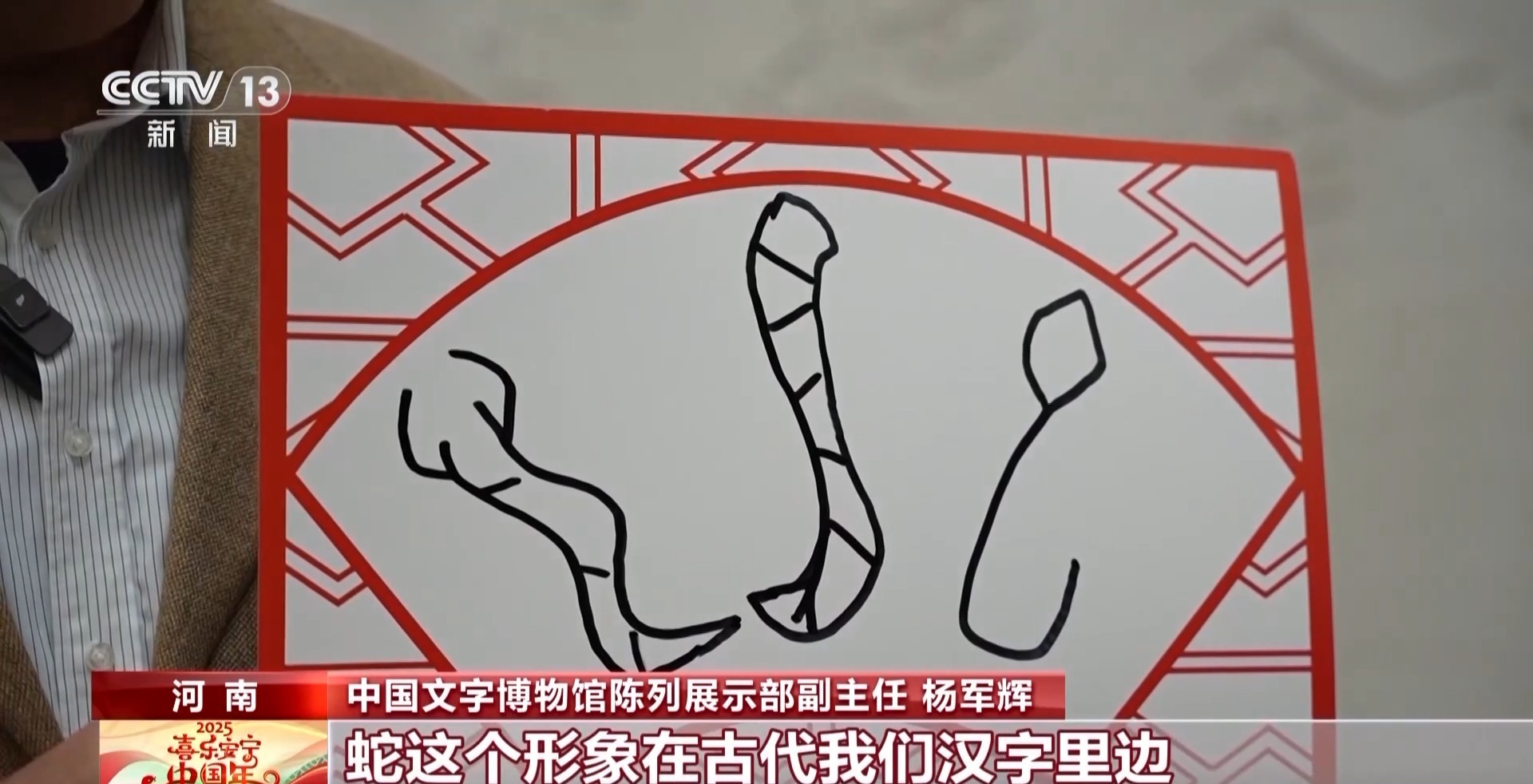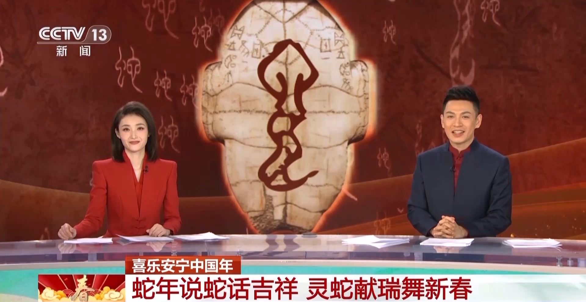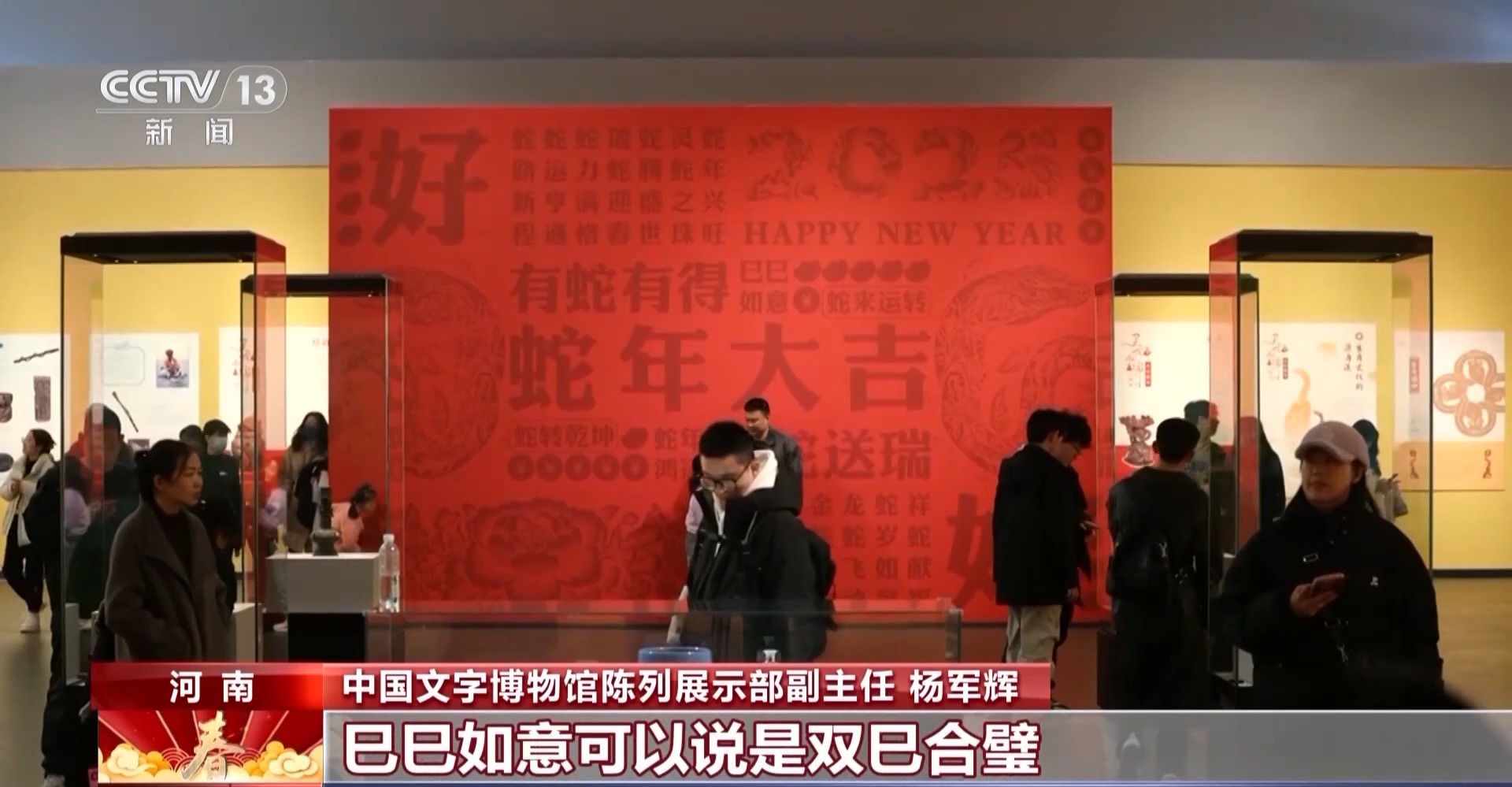 中国文字博物馆陈列展示部副主任 杨军辉:蛇象征着繁衍永生、智慧机敏,坚韧不拔。巳巳如意可以说是双巳合璧,寓意事事如意,饱含喜庆美满的家国祝福,彰显着中华民族生生不息的精神力量。