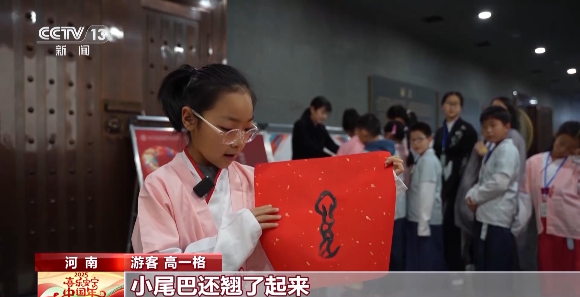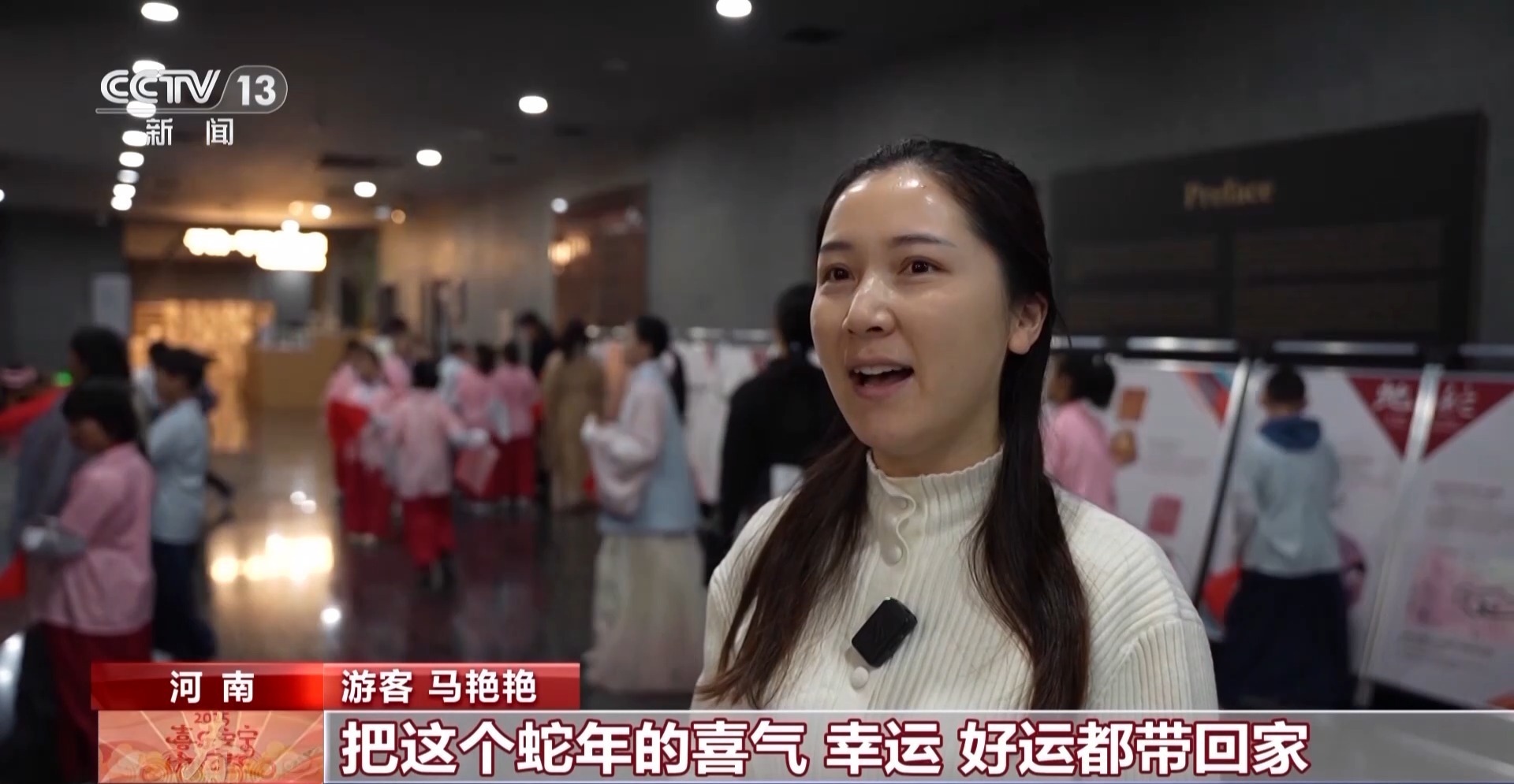 游客 马艳艳:甲骨文这个蛇跟咱们平时的蛇特别像,栩栩如生,觉得古代人特别有智慧。我也拿一个拓印回去,把这个蛇年的喜气、幸运、好运都带回家。