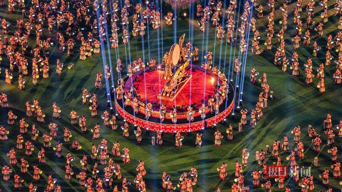 在灯光的中心,那座巨大的虎座鸟架鼓聚焦了所有人的目光,四个方阵共645人的琴鼓阵,传来的是磅礴向上的昂扬之音。