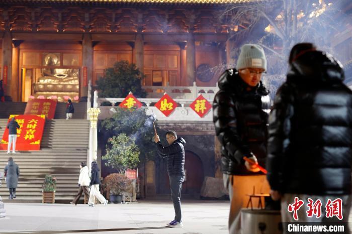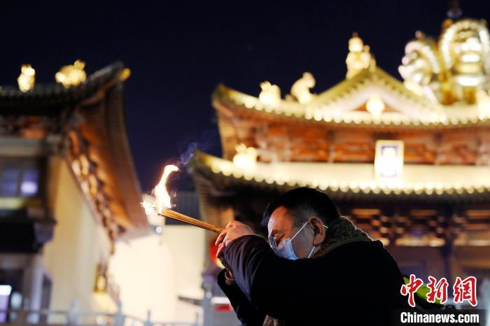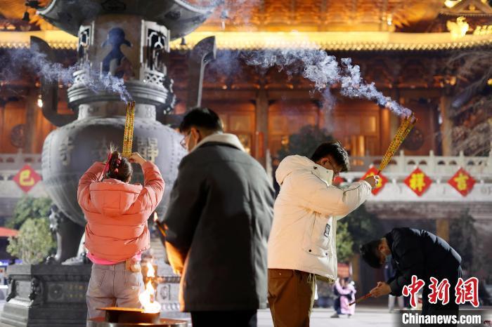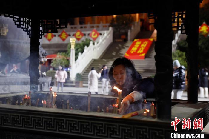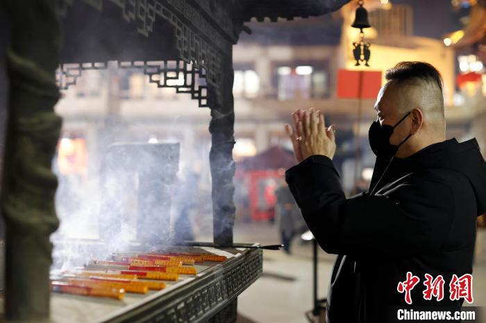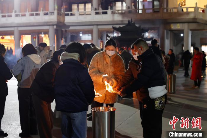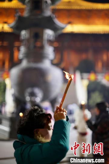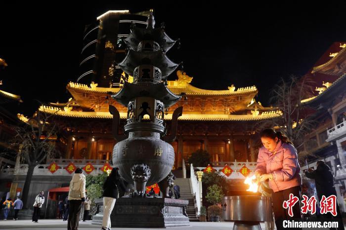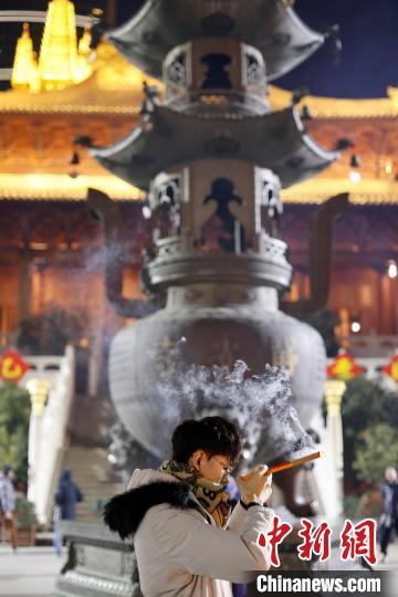 1月28日晚,农历除夕,在上海静安寺内,民众有序敬香祈福迎新年。除夕夜赴寺院撞钟烧香祈福是很多上海市民多年来的习俗。中新社记者 殷立勤 摄