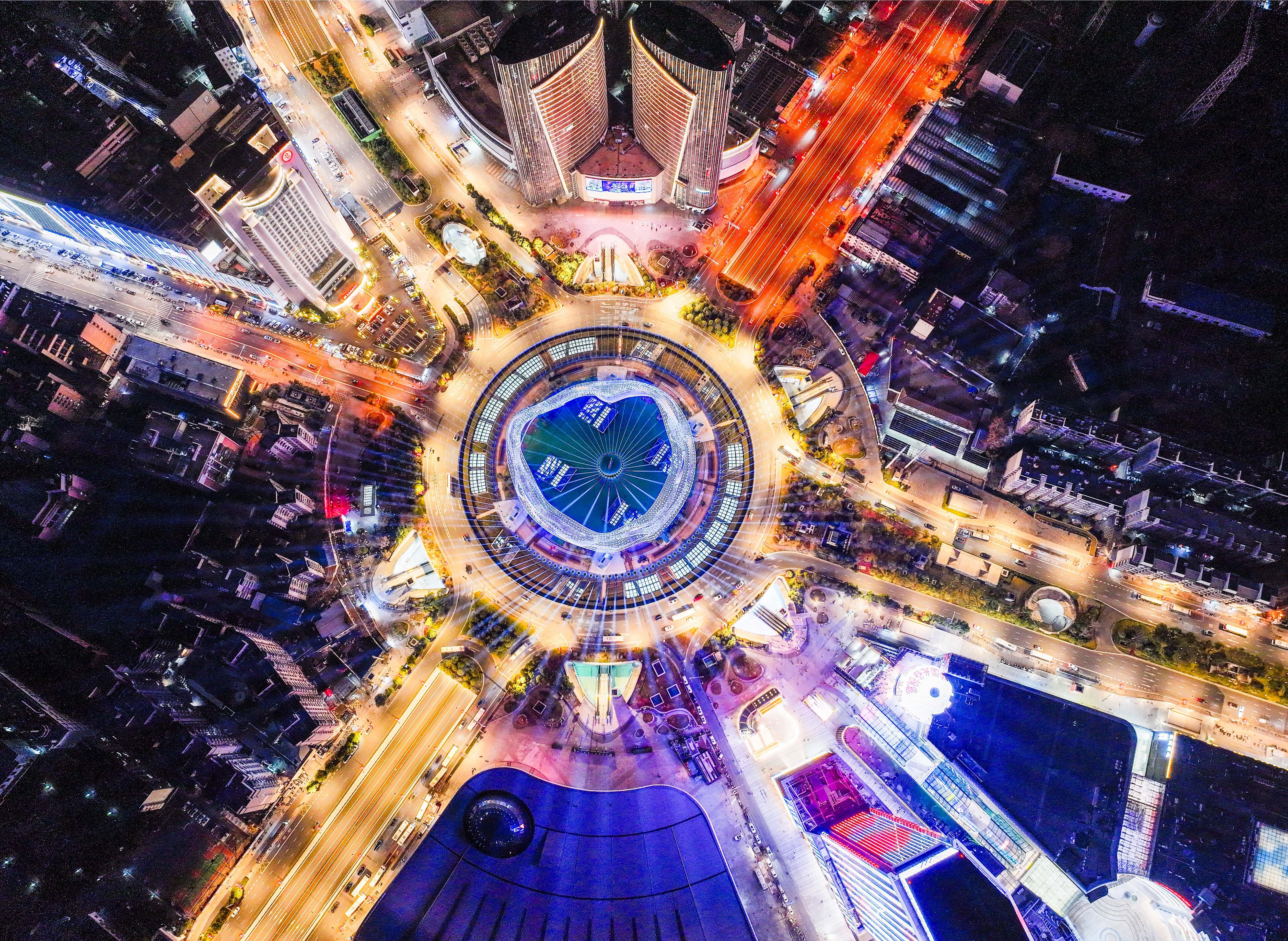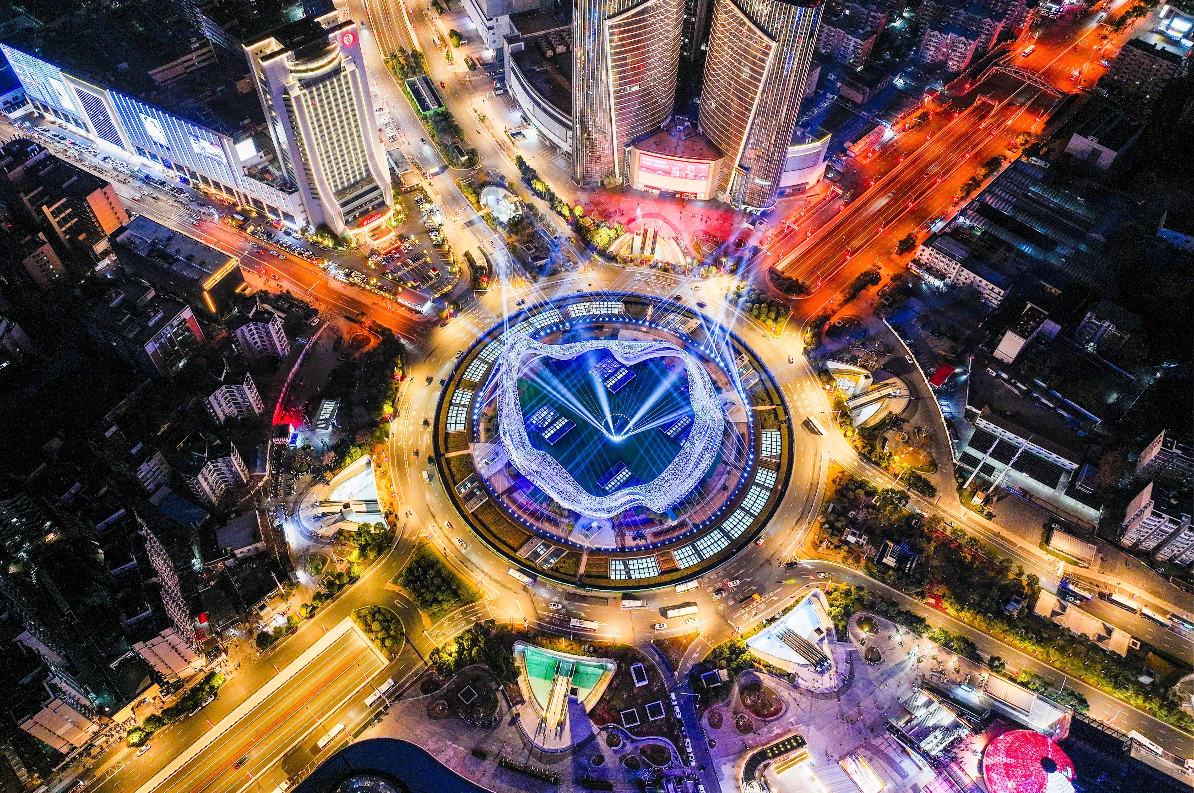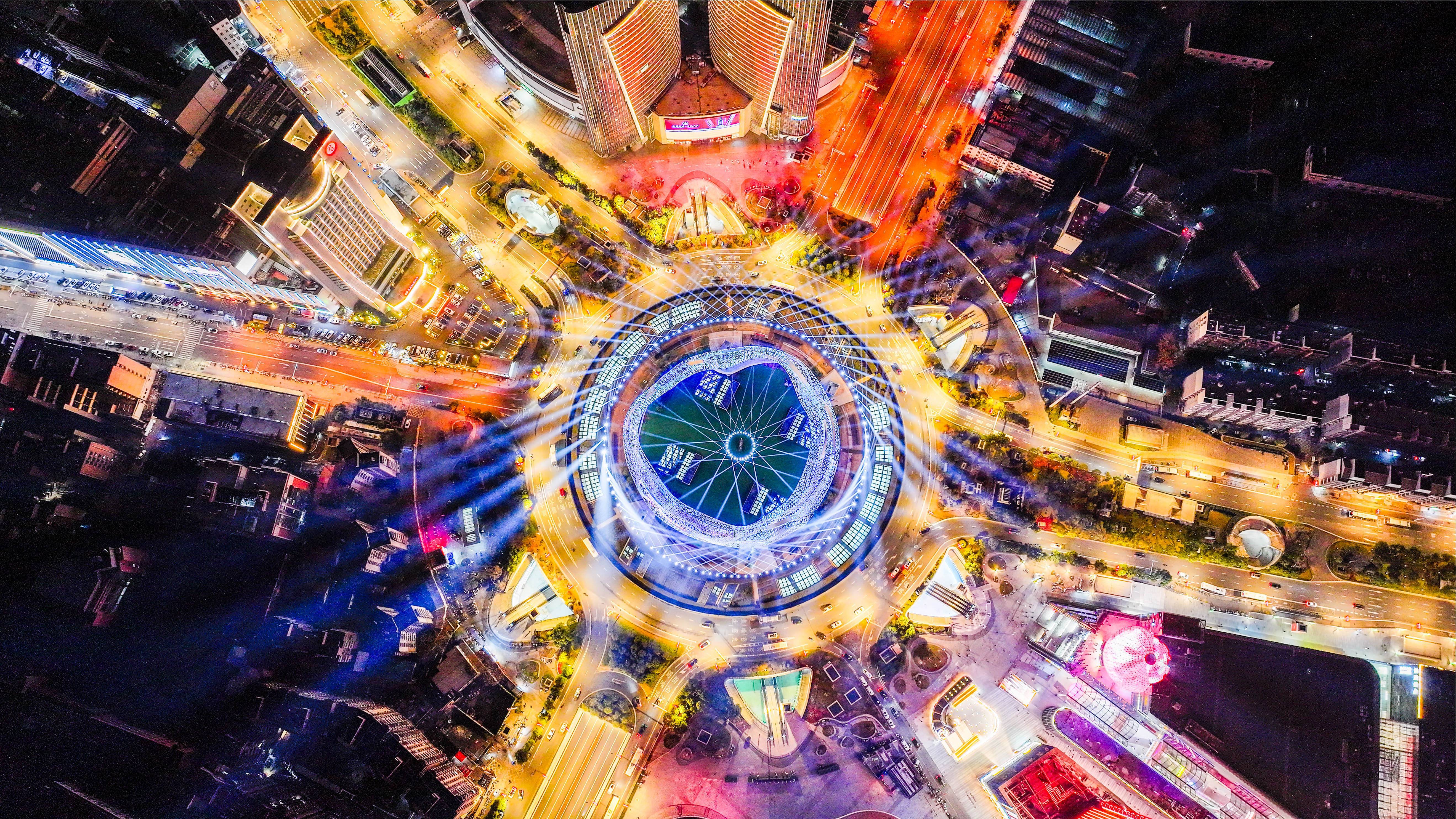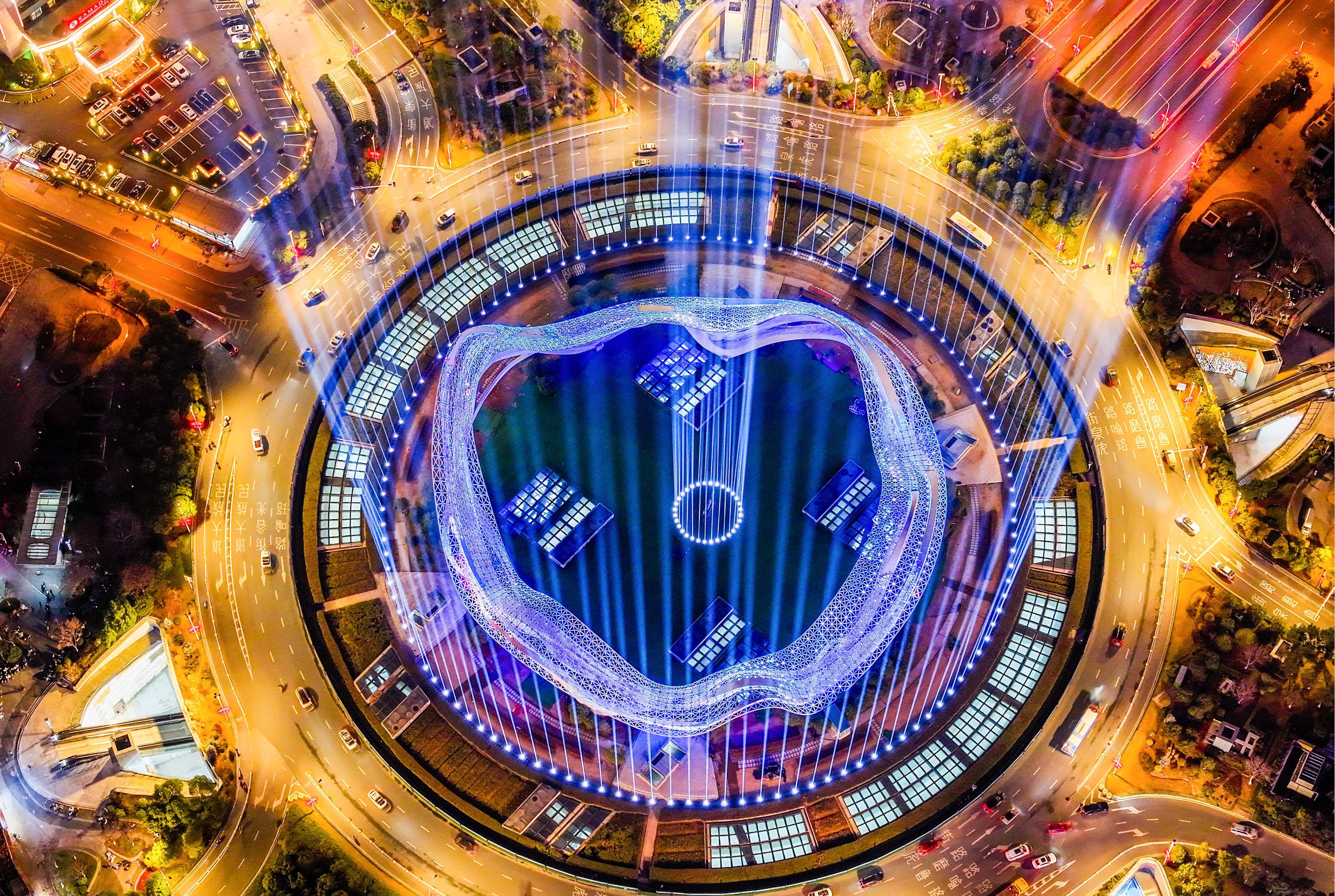 1月28日晚,光谷星河广场灯光璀璨,宛若“行星发动机”。