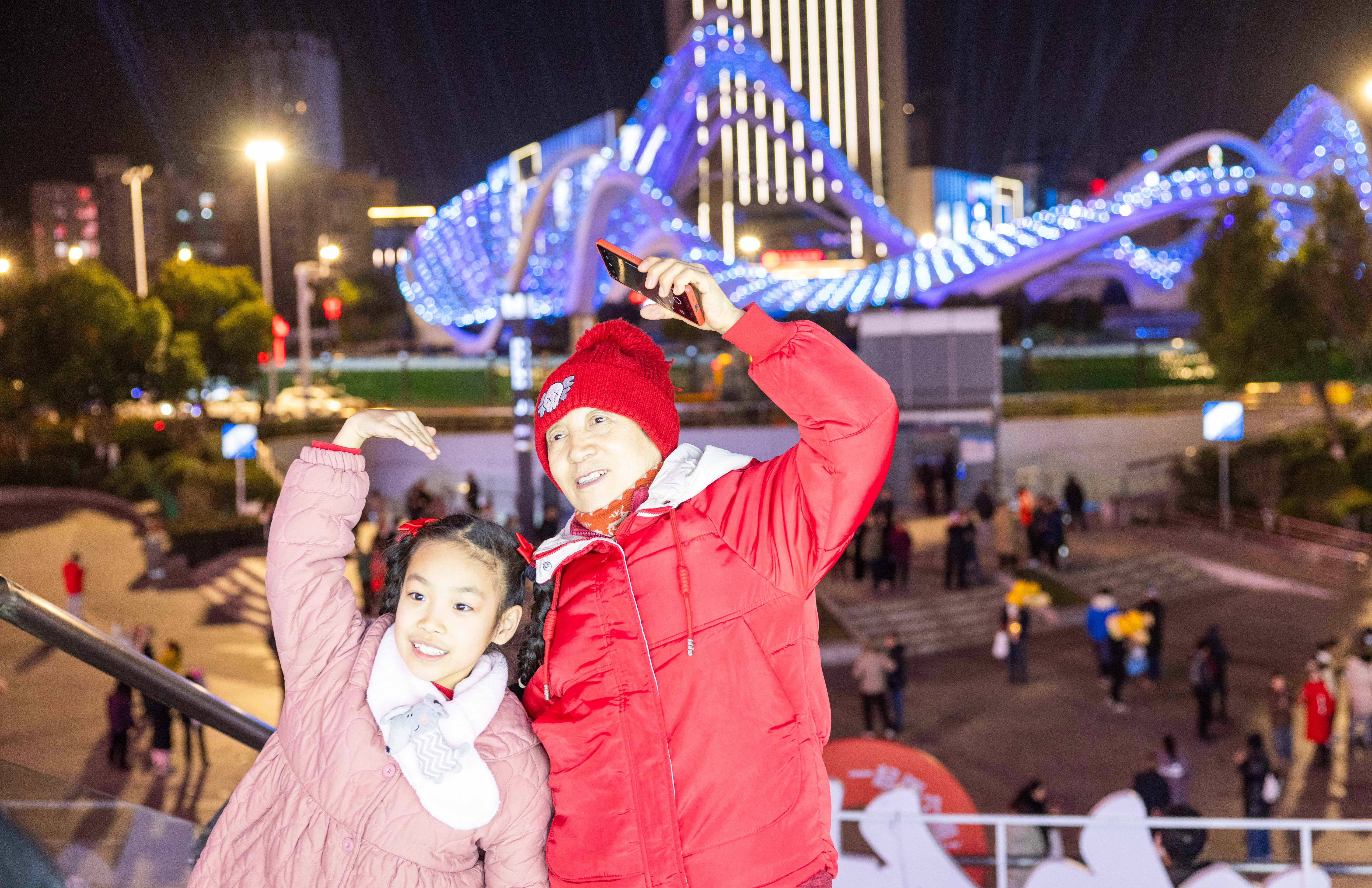 1月28日晚,光谷星河广场灯光璀璨,吸引众多市民游客打卡春晚同款地标。
