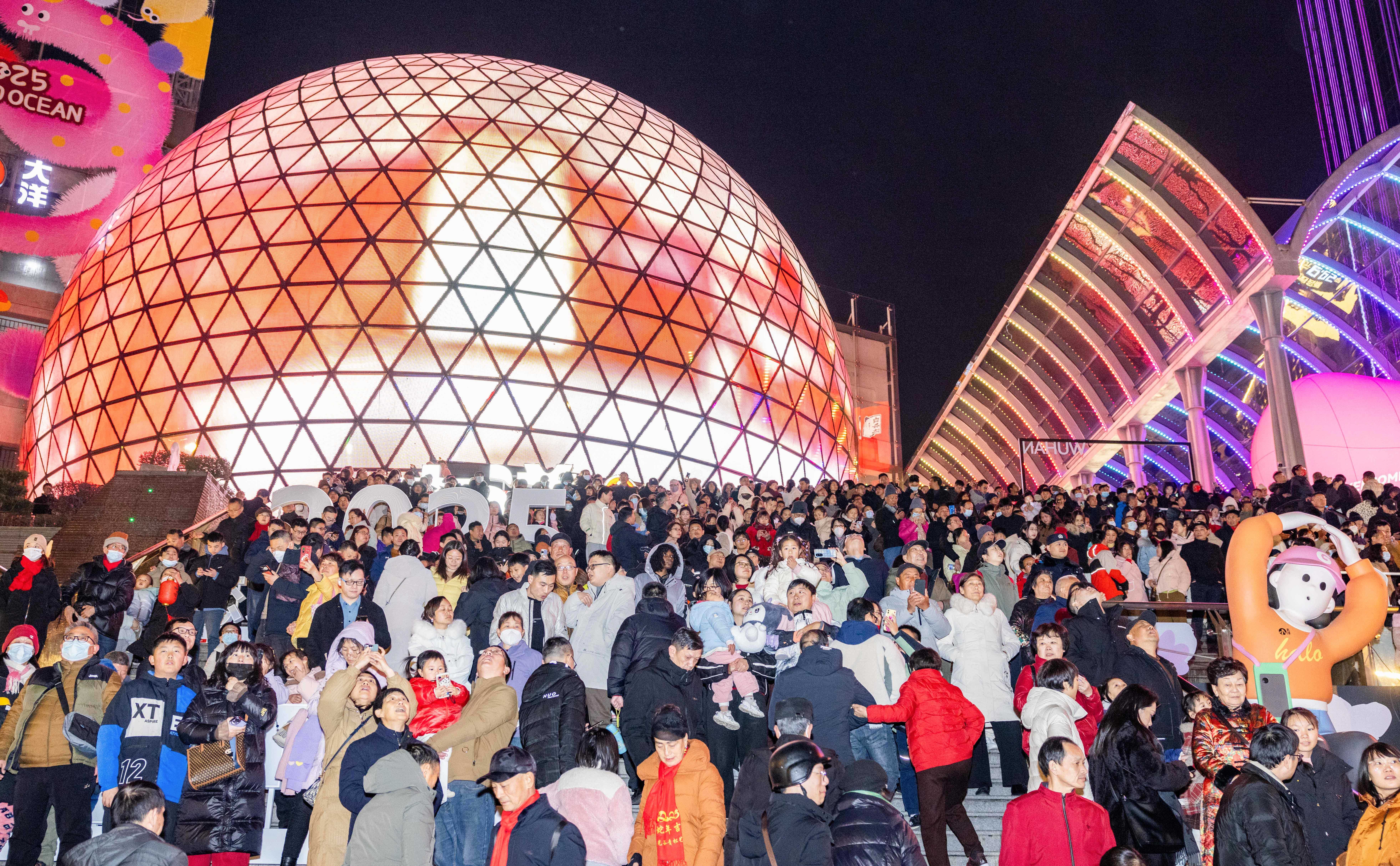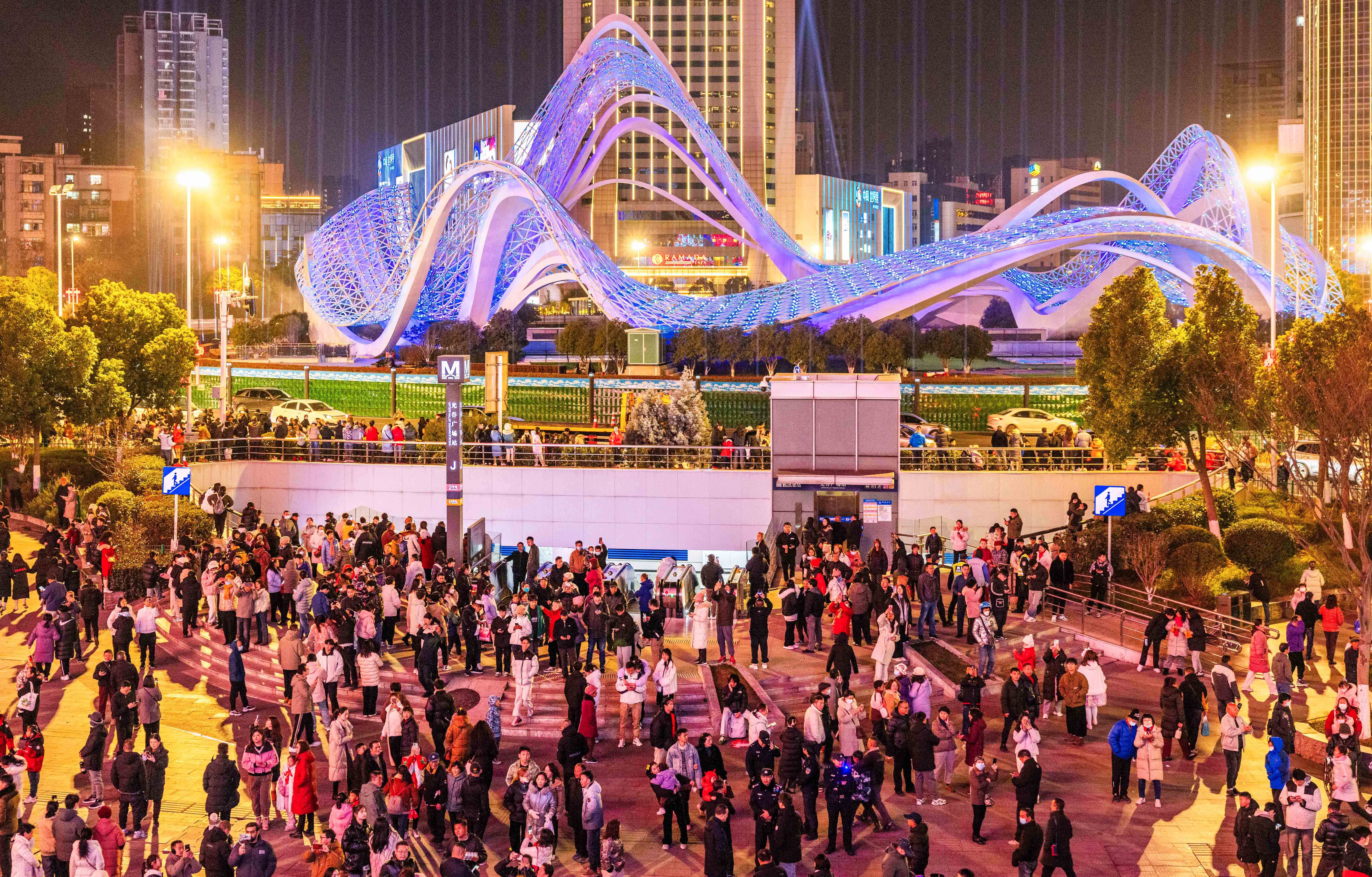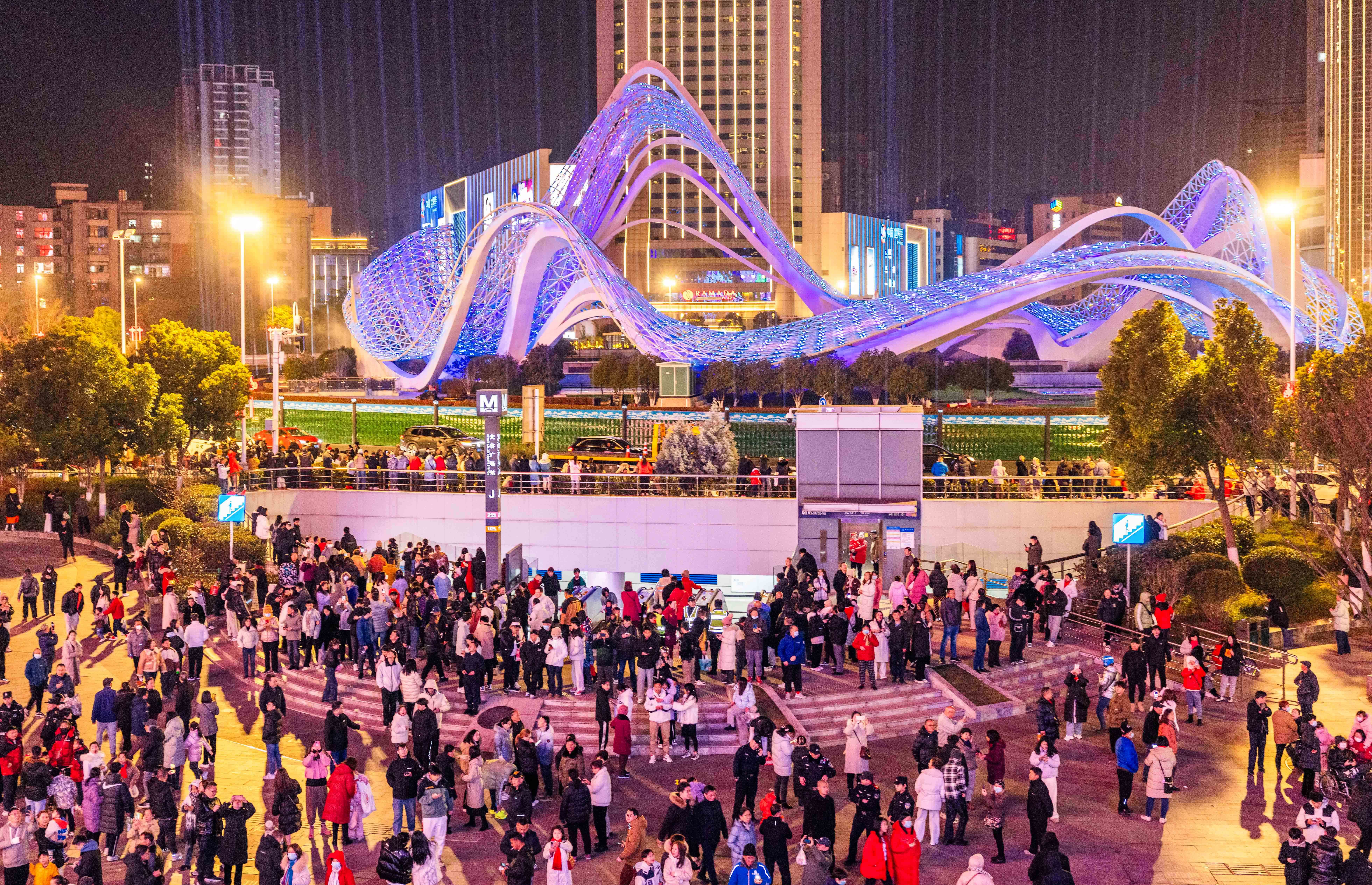 1月28日晚,武汉光谷星河广场灯光璀璨,众多市民游客前来打卡春晚同款地标。(湖北日报全媒记者 薛婷 摄)