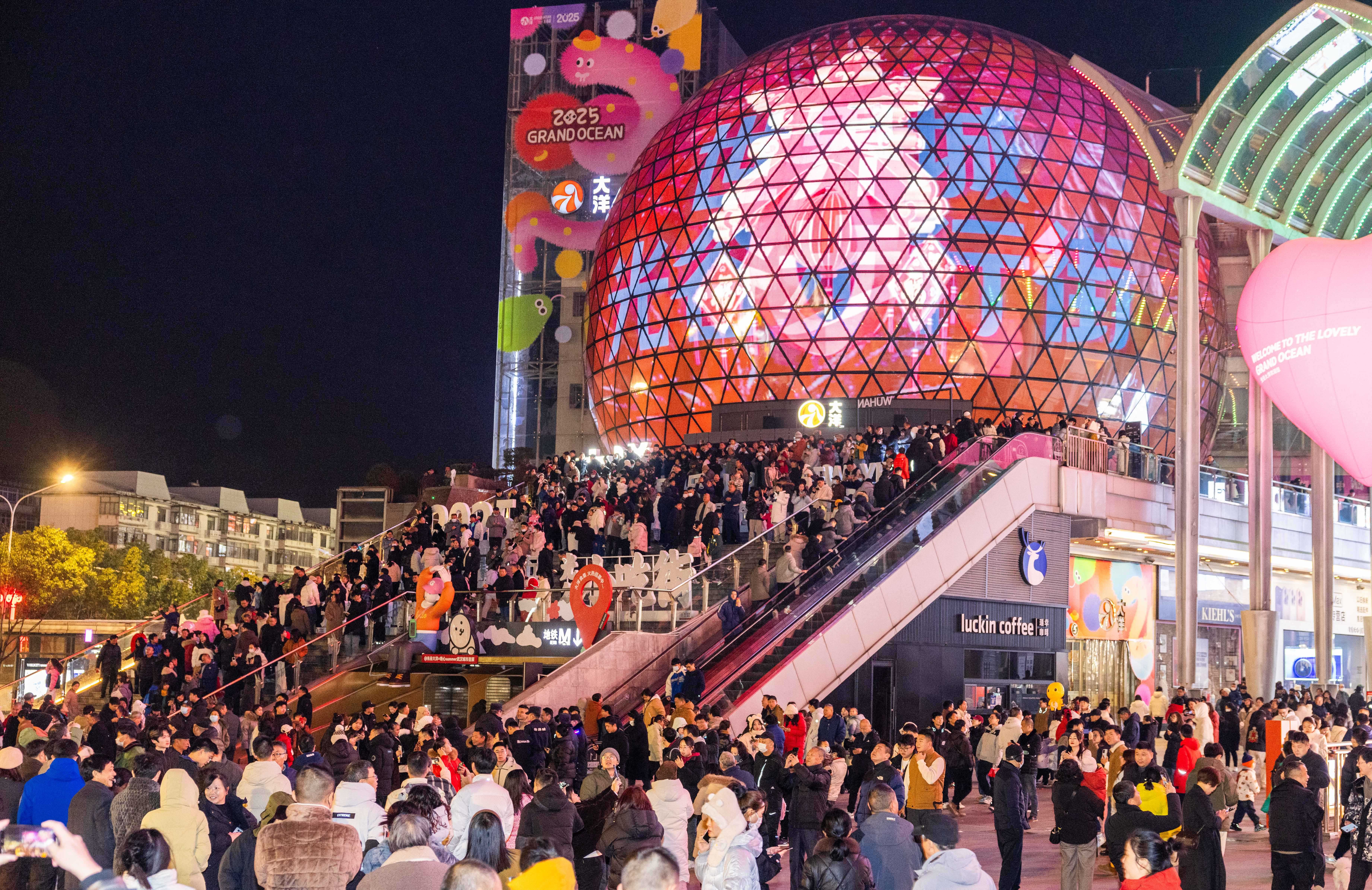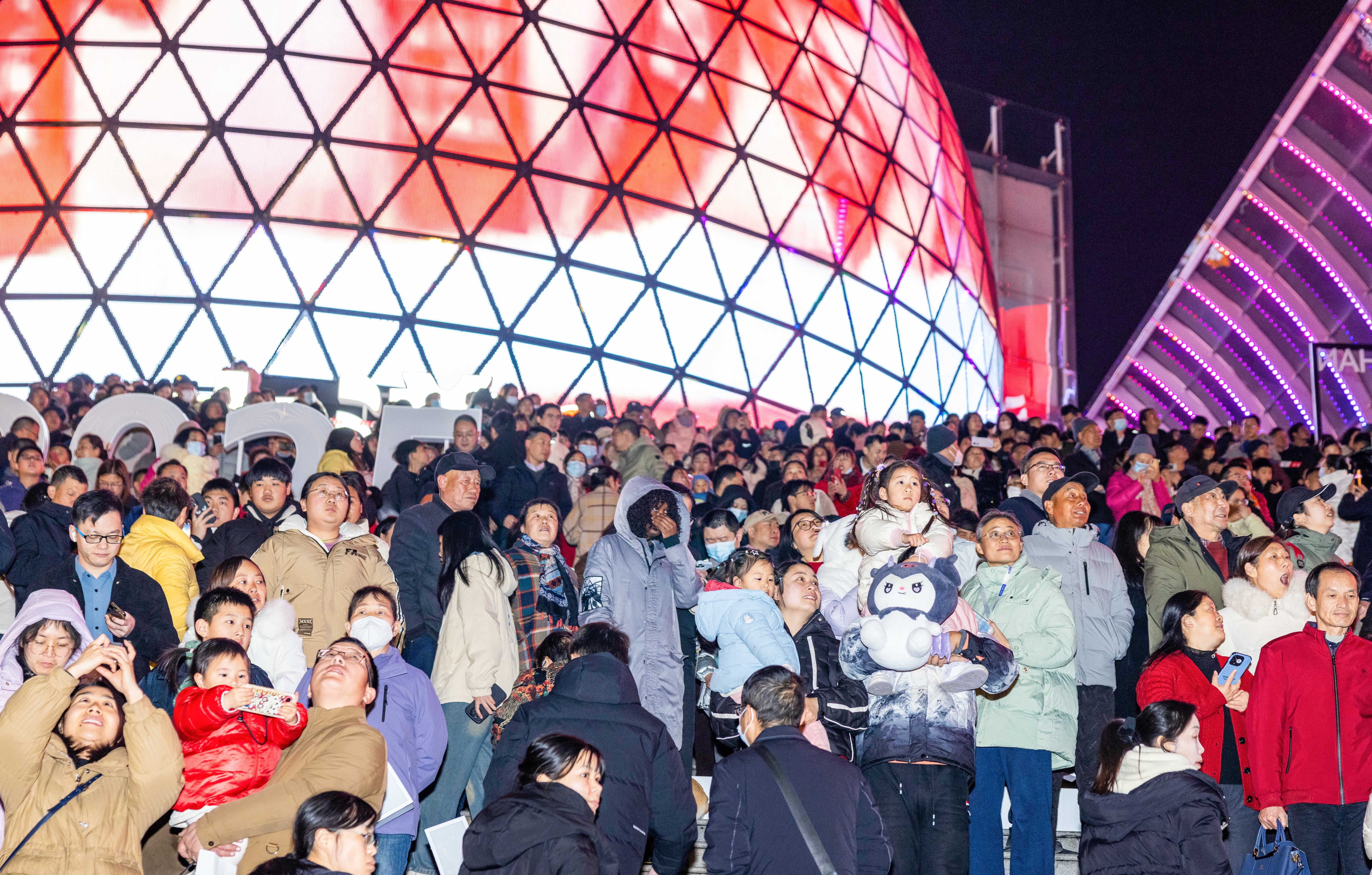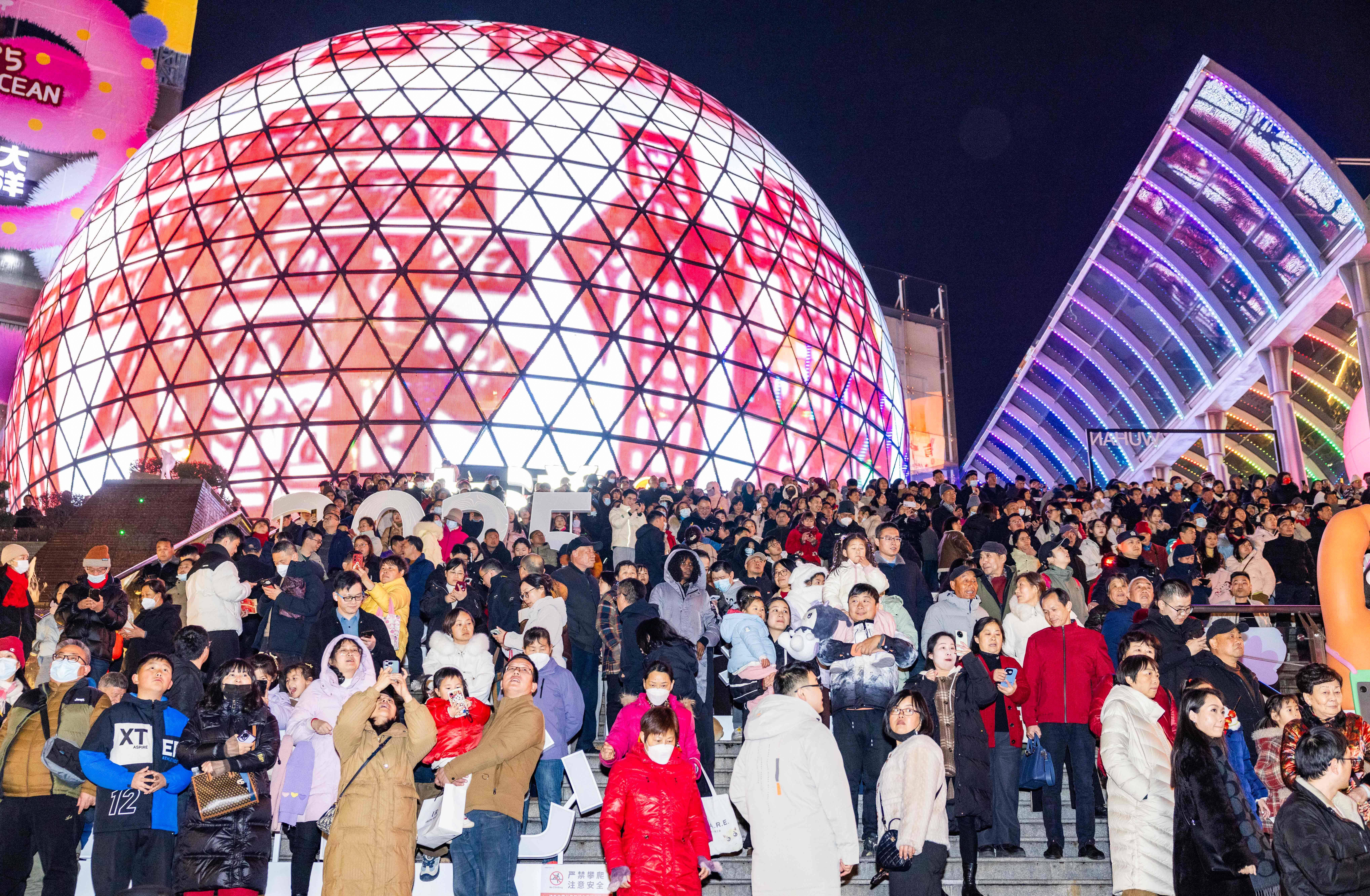 1月28日晚,武汉光谷星河广场灯光璀璨,众多市民游客前来打卡春晚同款地标。(湖北日报全媒记者 薛婷 摄)