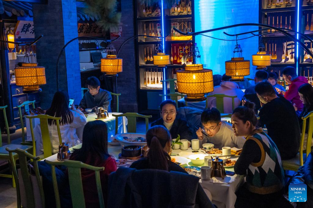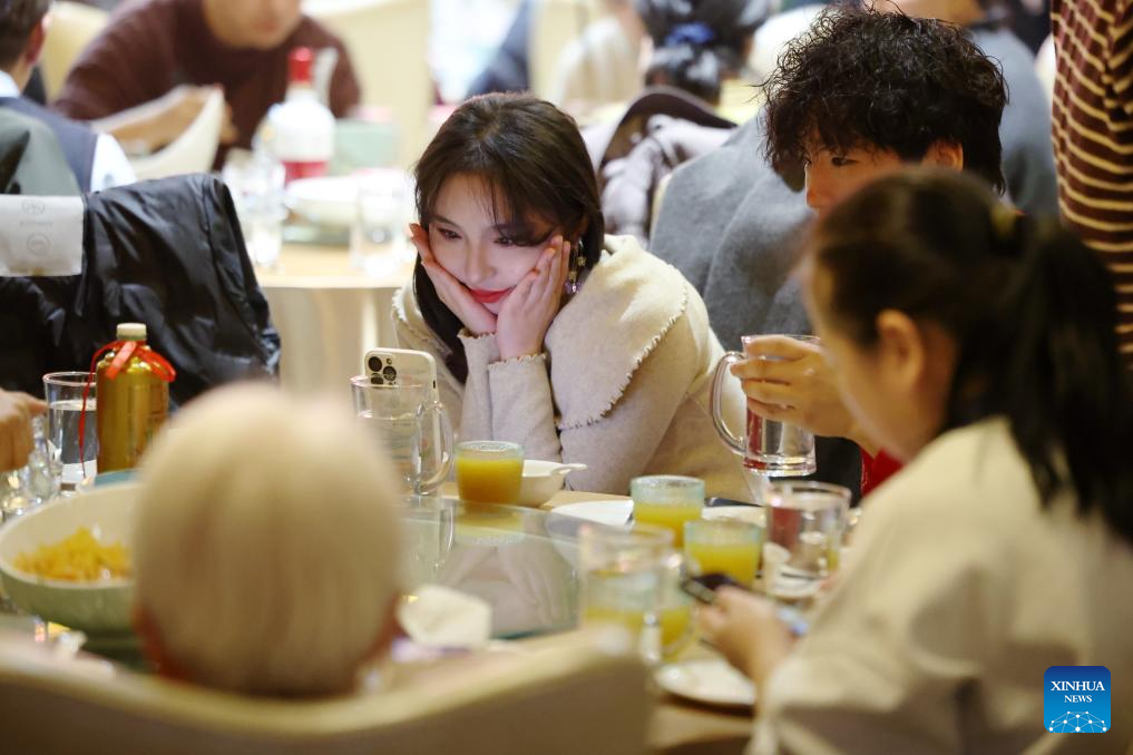 People have a reunion meal at a restaurant in Nanjing City, east China's Jiangsu Province, Jan. 28, 2025. Dining with family members in a reunion meal has been a cherished tradition for the Chinese on the eve of the Spring Festival, which falls on Jan. 29 this year. (Photo by Zhang Meng/Xinhua)