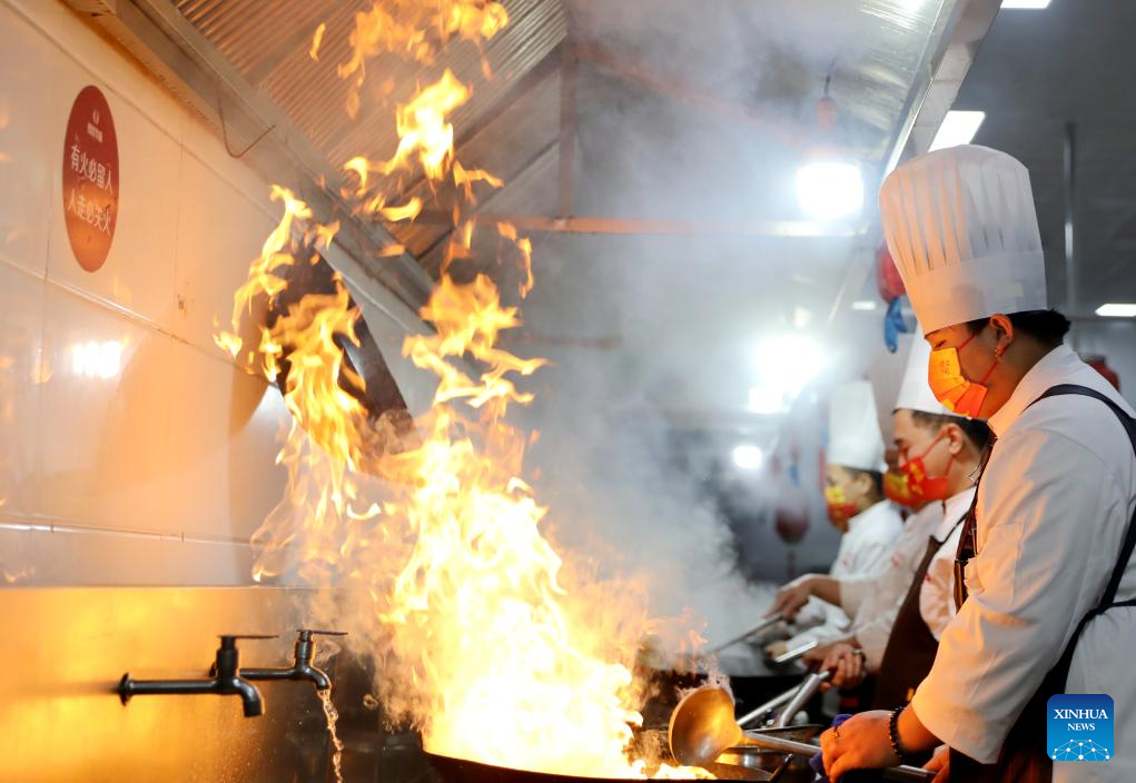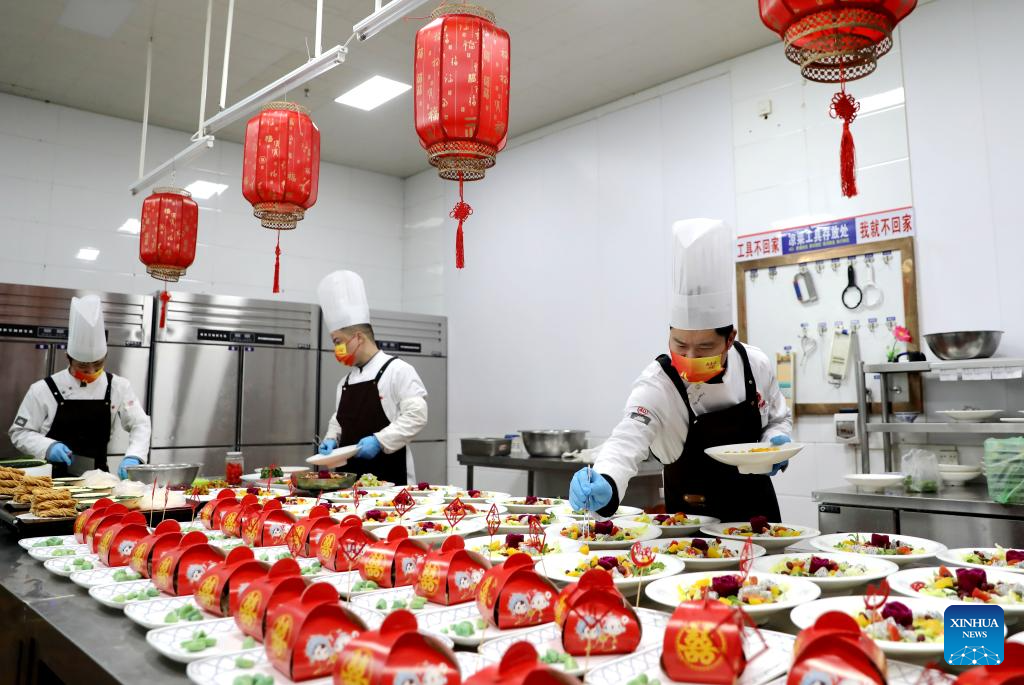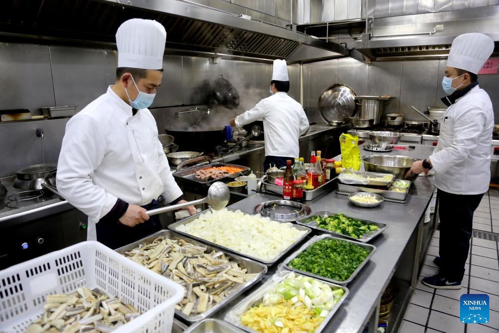 Chefs prepare reunion meals at a restaurant in Jiyuan City, central China's Henan Province, Jan. 28, 2025. Dining with family members in a reunion meal has been a cherished tradition for the Chinese on the eve of the Spring Festival, which falls on Jan. 29 this year. (Photo by Duan Erping/Xinhua)