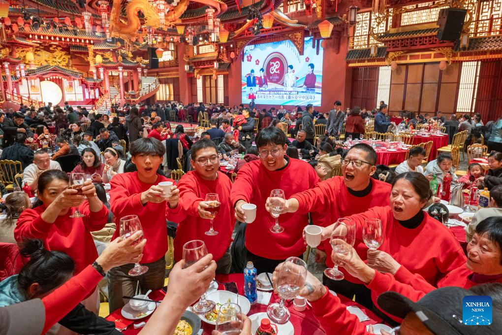 People have reunion meals at a restaurant in Lanzhou City, northwest China's Gansu Province, Jan. 28, 2025. Dining with family members in a reunion meal has been a cherished tradition for the Chinese on the eve of the Spring Festival, which falls on Jan. 29 this year. (Xinhua/Chen Bin)