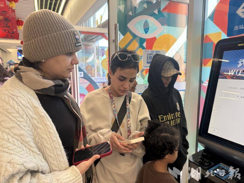 沙特阿拉伯留学生Sara带着孩子们购买光谷空轨客票。