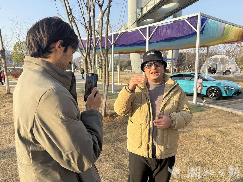 中南财经政法大学留学生Aftab来自巴基斯坦,大年初一下午,他和两位同学打卡光谷空轨,并开启TikTok直播,向全球网友推介武汉。