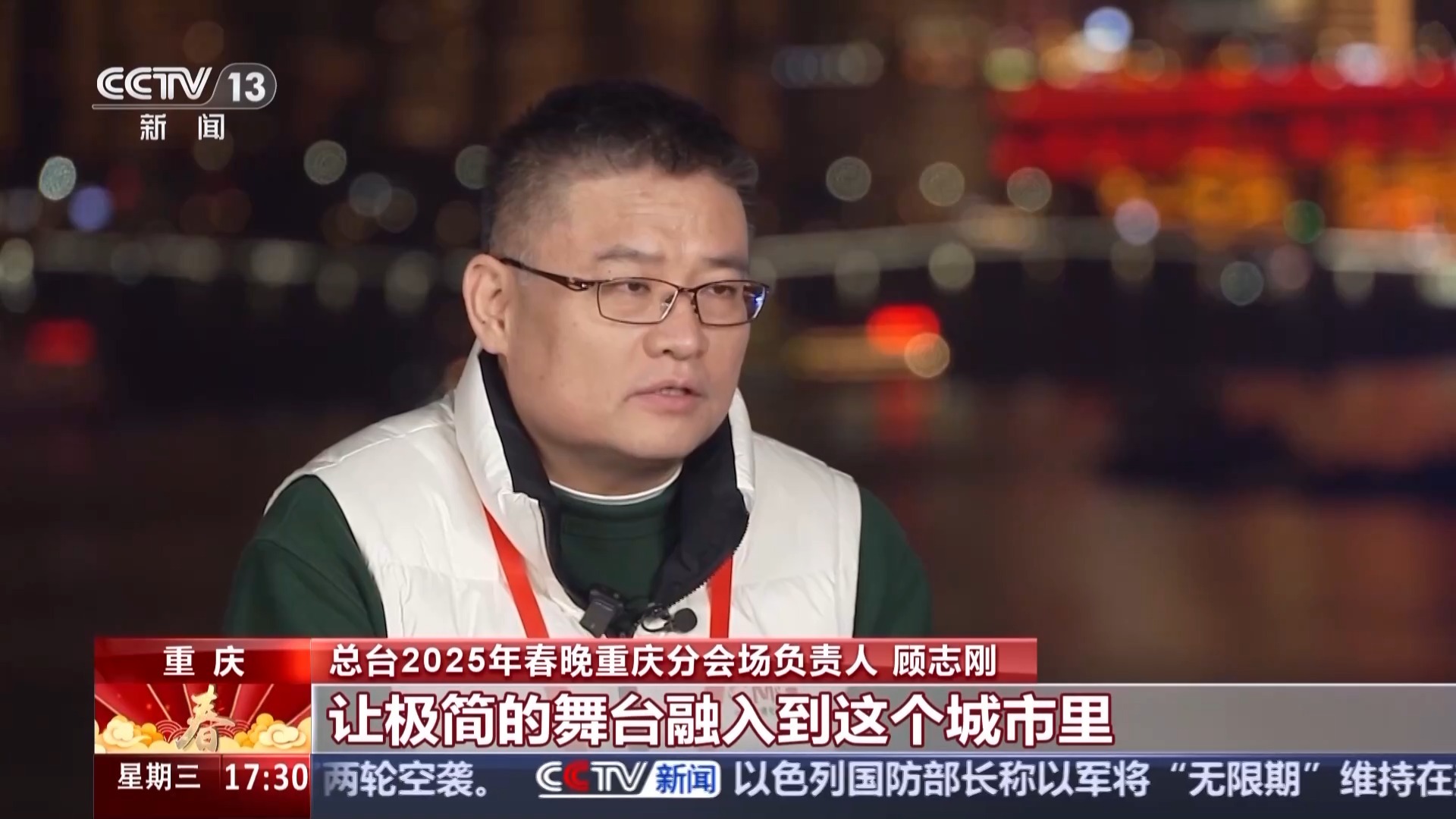 总台2025年春晚重庆分会场负责人 顾志刚:我们的舞台把它做到极简化的处理,让这个舞台没有大型的装置,让极简的舞台融入到这个城市里。让观众感受到两江交汇处,山环水绕,一眼重庆。