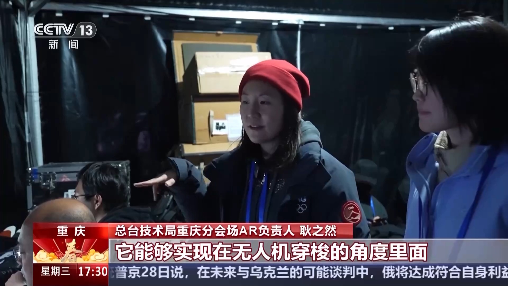 总台技术局重庆分会场AR负责人 耿之然:它能够实现在无人机穿梭的角度里面同时叠加虚拟的视觉效果,这个是今年咱们在重庆分会场总台技术局新的技术使用。