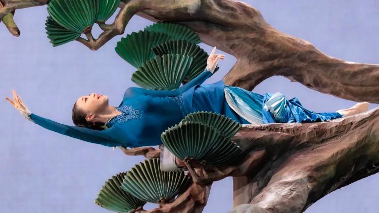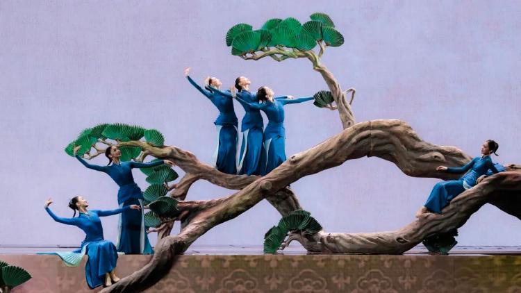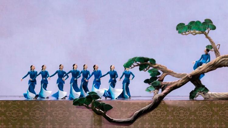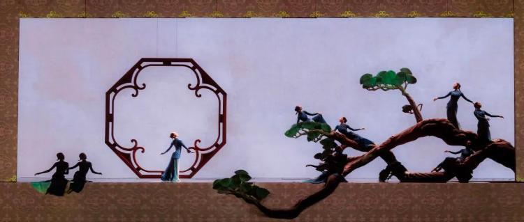 宋画以笔触细腻、意境深远著称,尤其是花鸟画,在宋朝迎来了独树一帜的黄金时代。编导参考大量宋画作品,尤其从南宋画家林椿的《十全报喜图》中获取灵感,将宋画的美学哲学完美地转译为舞蹈中的构图逻辑。舞台背景是纹理清晰的画布,幕帘和升降地屏搭建出裱框,整个舞台如同从水平面上翻转而立,变成巨幅的国画卷轴。
