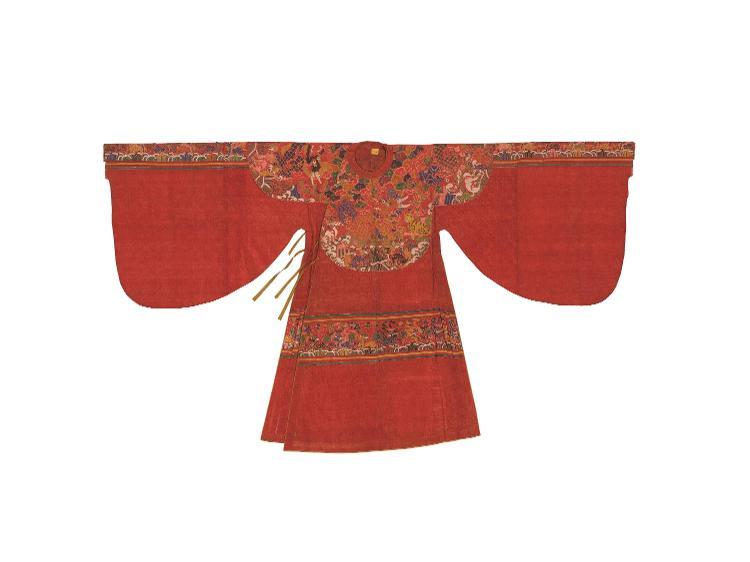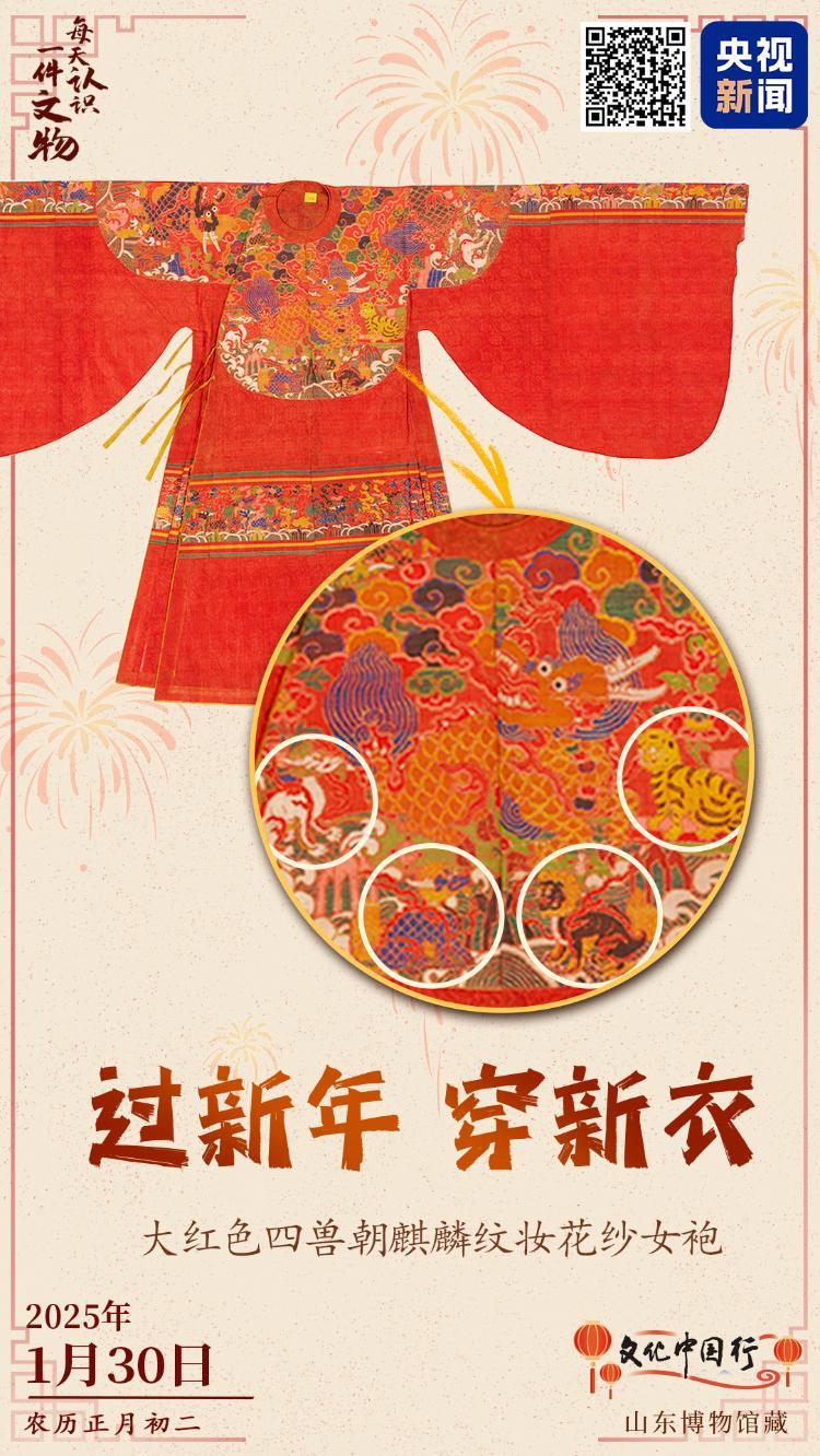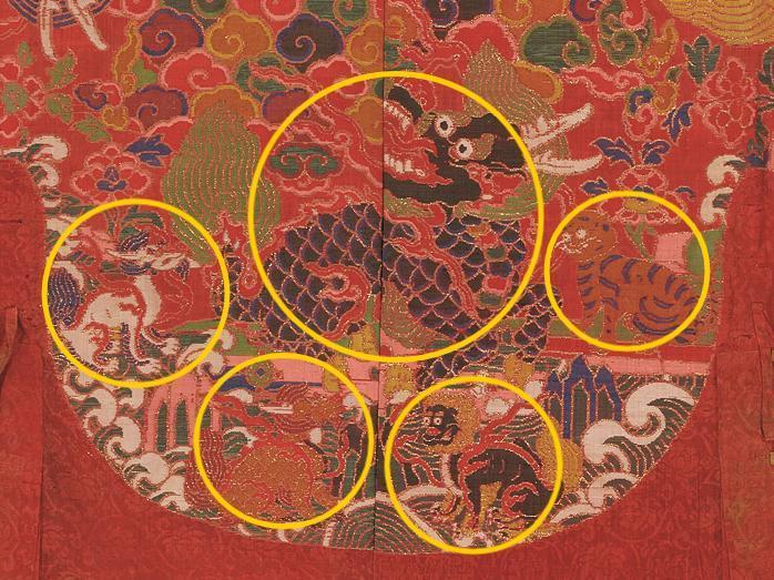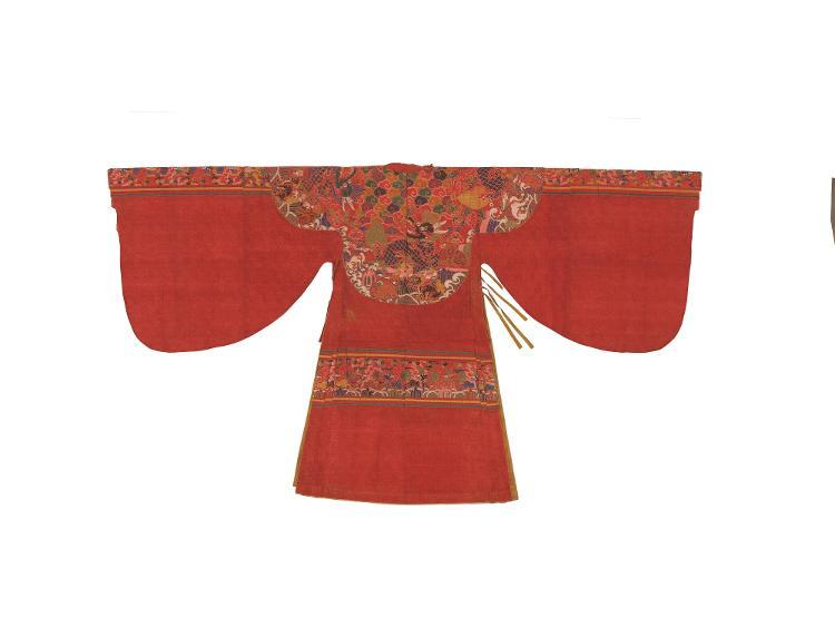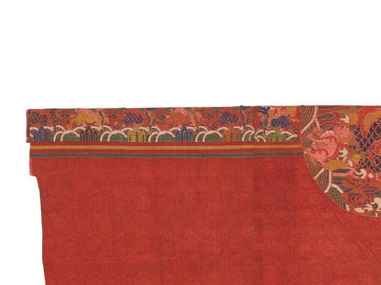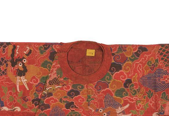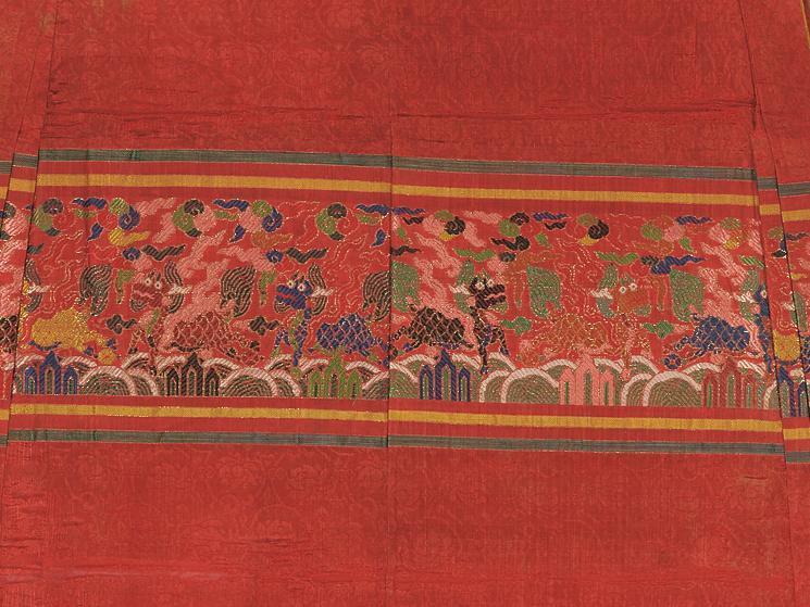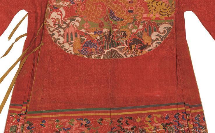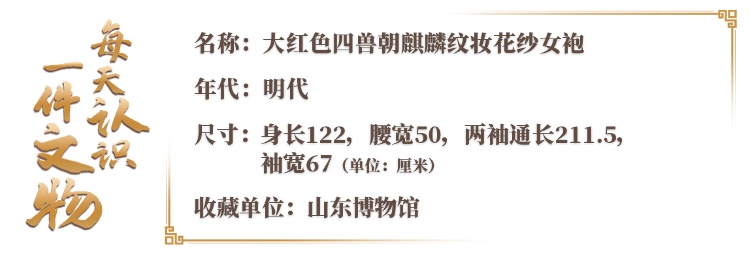 这件大红色四兽朝麒麟纹妆花纱女袍