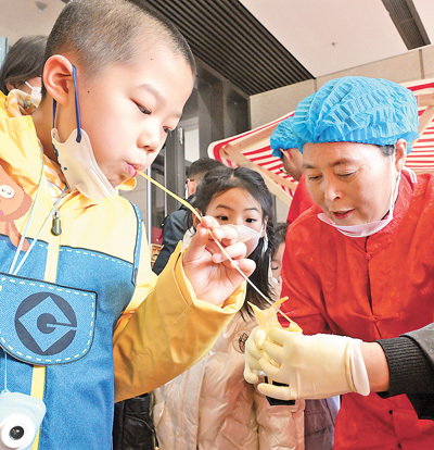 北京中国非物质文化遗产馆,小朋友在“过年——春节主题展”上体验吹糖人。新华社记者 李 贺摄
