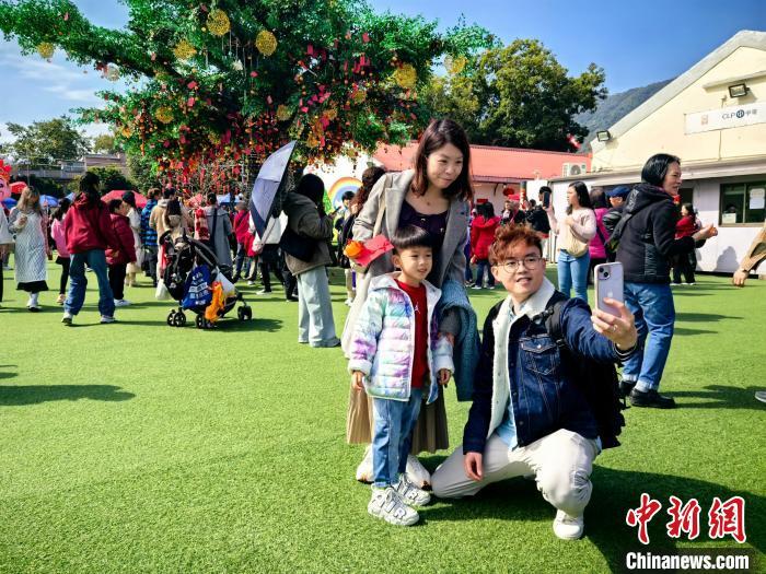 1月29日,“香港许愿节2025”在香港大埔区林村许愿广场举行。往广场中央的许愿树上抛“宝牒”是许愿节重点活动,吸引大批民众前来。图为香港市民在许愿树前合影。 中新社记者 刘大炜 摄