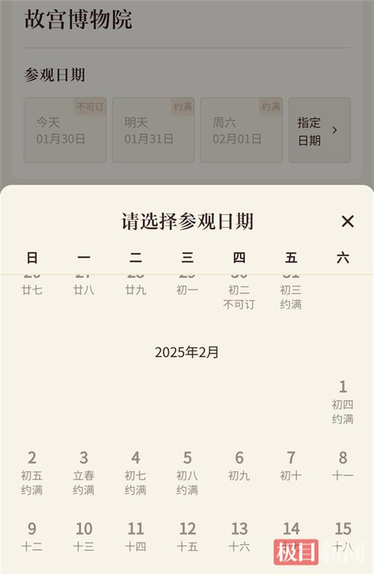 30日下午,记者从多个平台了解到,北京故宫博物院2月5日(正月初八)前的门票已经全部约满售罄。
