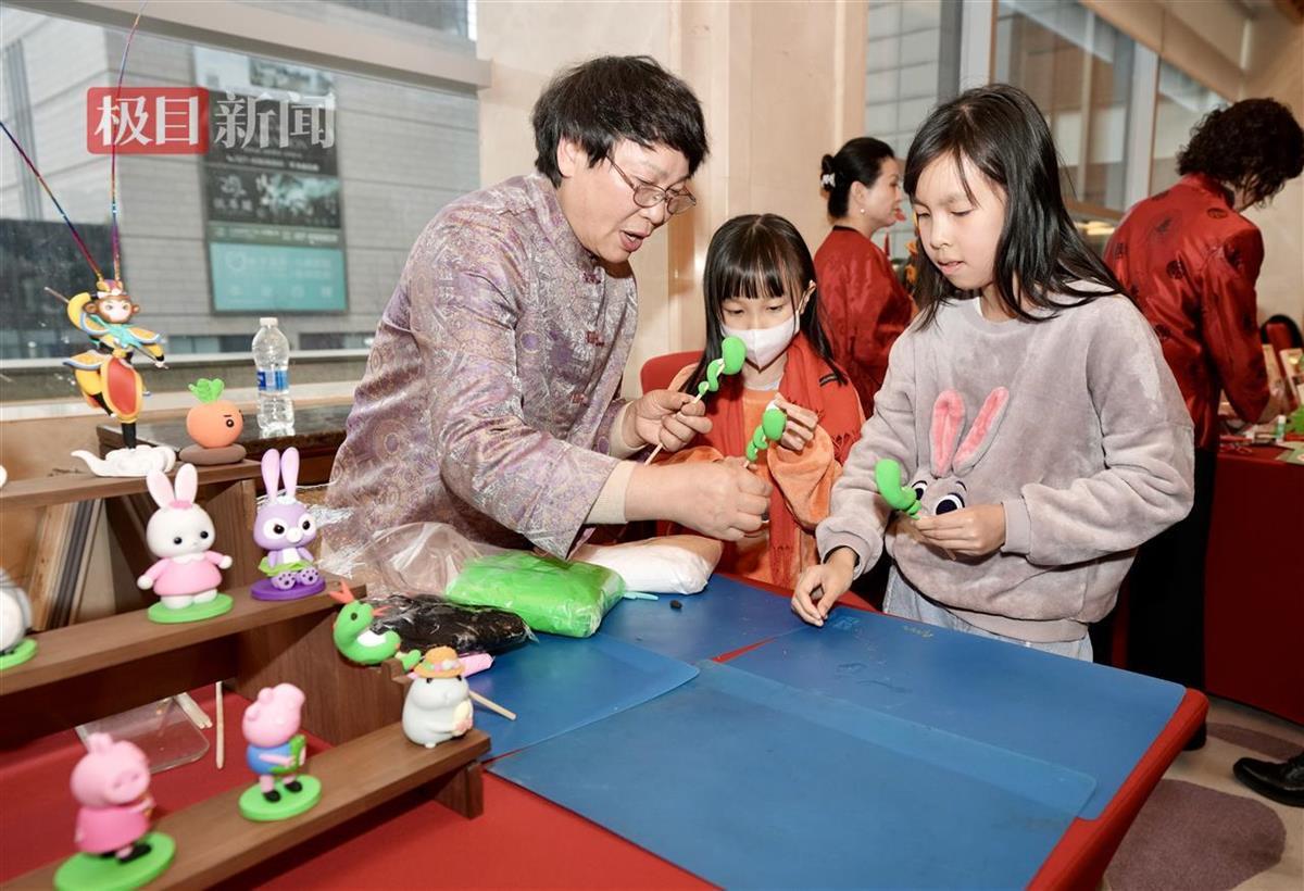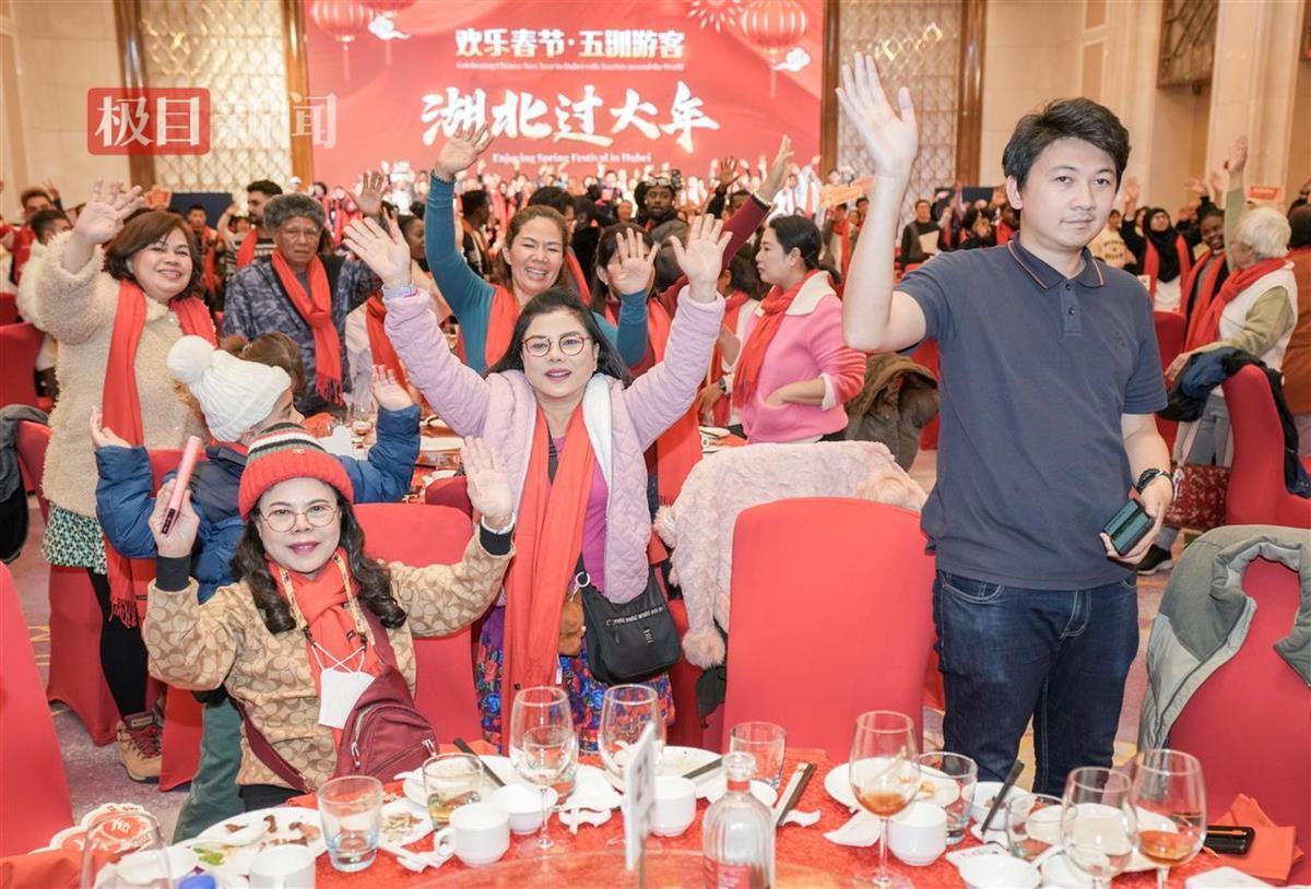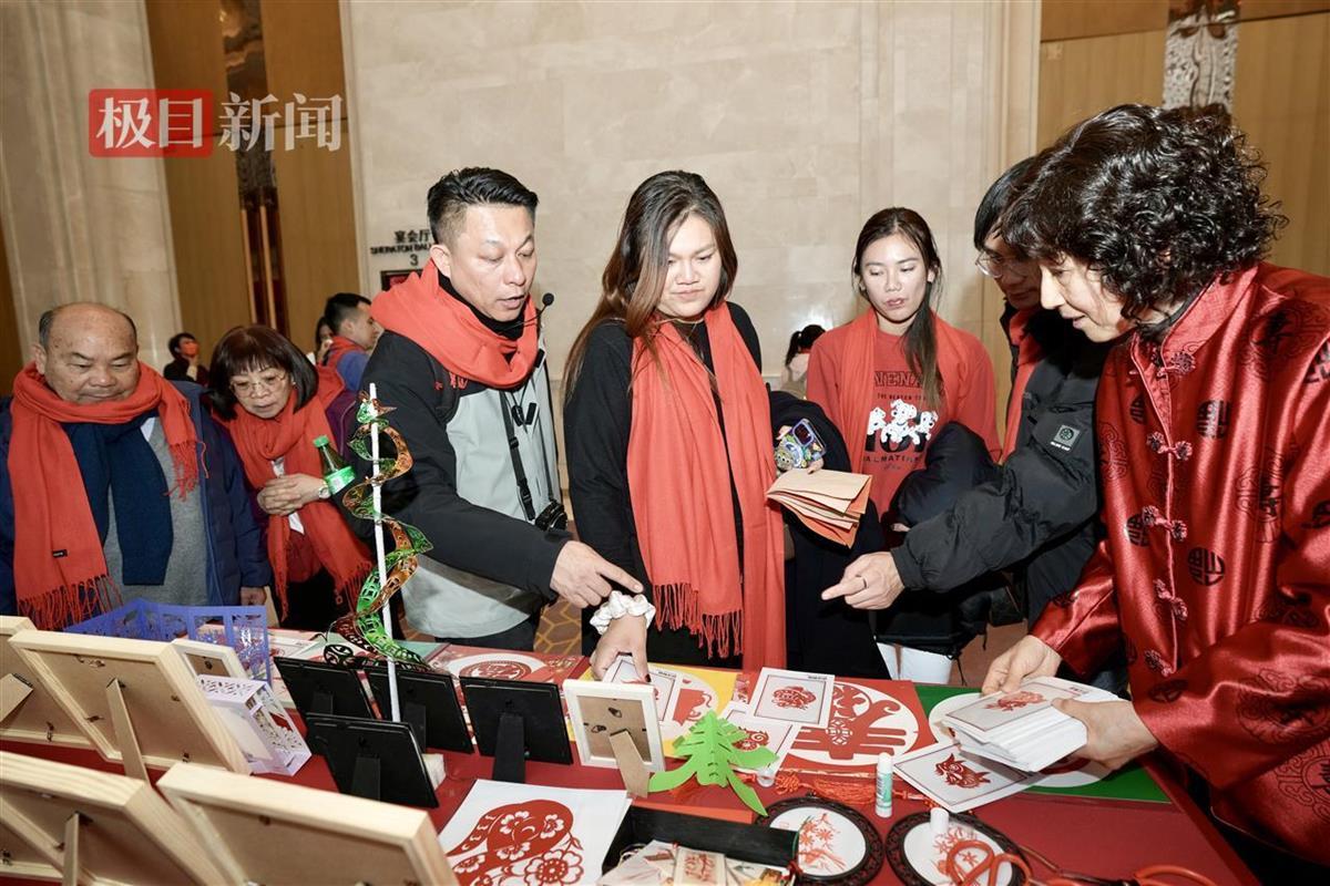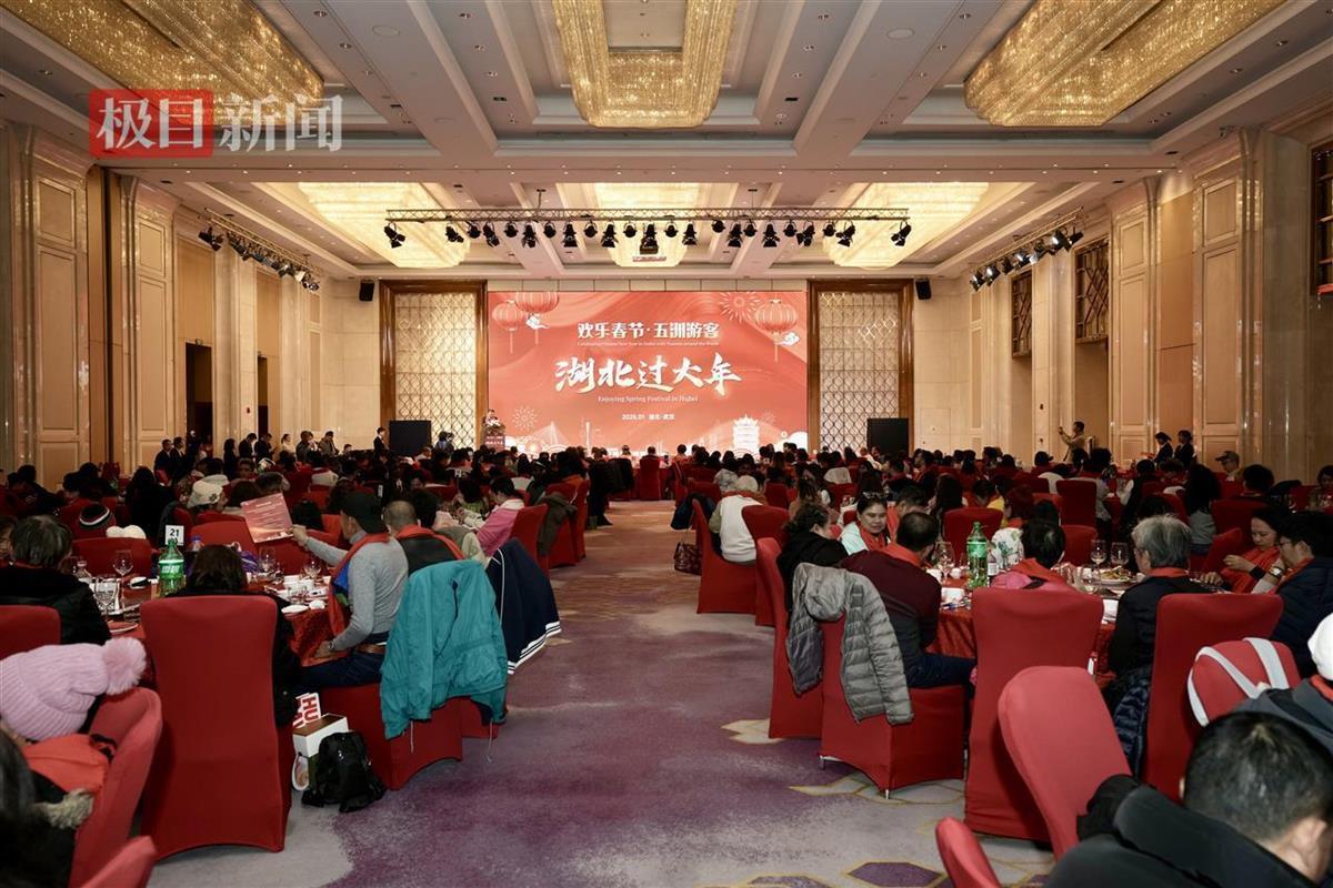 在“欢乐春节·五洲游客湖北过大年”活动的欢迎晚宴现场,主办方精心安排了写春联、剪窗花、捏面塑等一系列极具特色的传统习俗体验活动。
