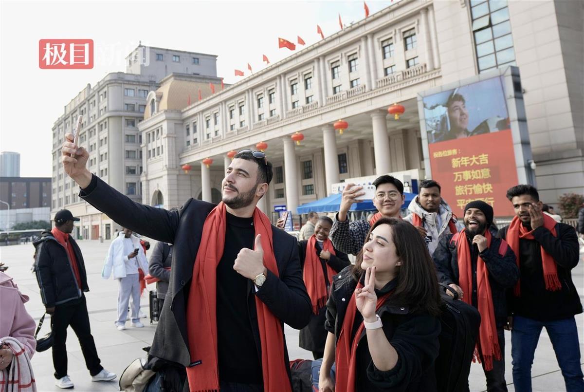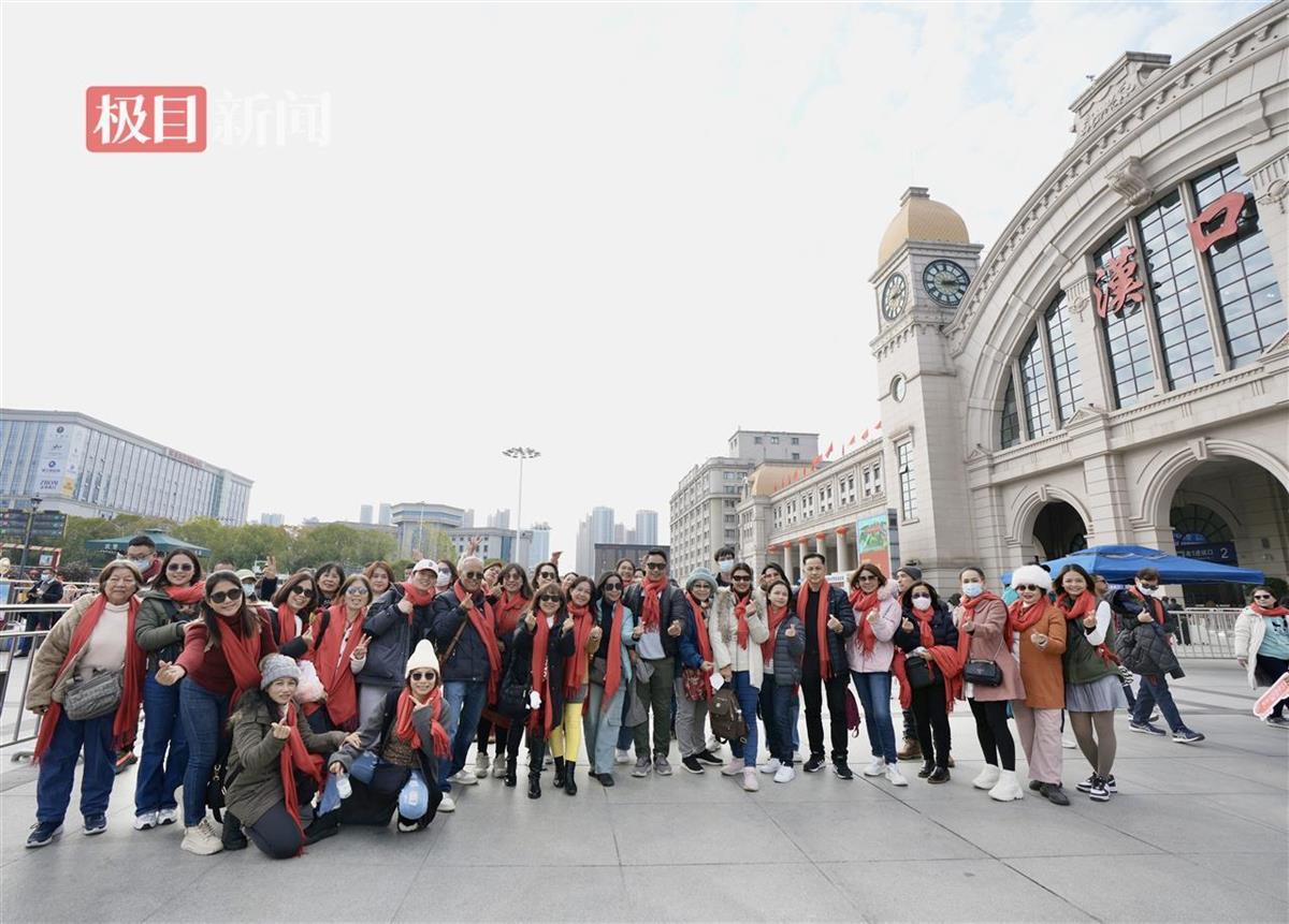 “武汉,我们来啦!”汉口火车站广场上,众多外国游客脸上洋溢着兴奋与期待,一同定格下这具有纪念意义的大合影。