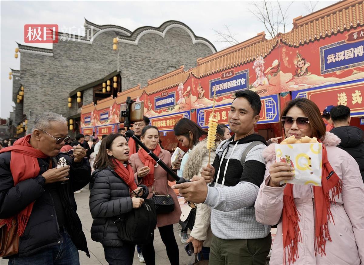 红灯笼高高挂起,各式各样的传统手工艺品琳琅满目;糖画师傅以铜勺为笔、糖浆为墨,手腕轻转间勾勒出腾龙造型;汉绣传承人指尖翻飞,将金丝银线绣成栩栩如生的“龙凤呈祥”图案……当天,境外游客参观了武汉园博园、汉口里等景点,打卡春晚武汉分会场拍摄地,了解湖北庙会、花灯、非遗民俗等春节文化。作为楚文化的发祥地,湖北有着丰富多彩的传统习俗,境外游客被热闹非凡的春节市集所吸引,纷纷拍照打卡,永久留下美好的记忆。