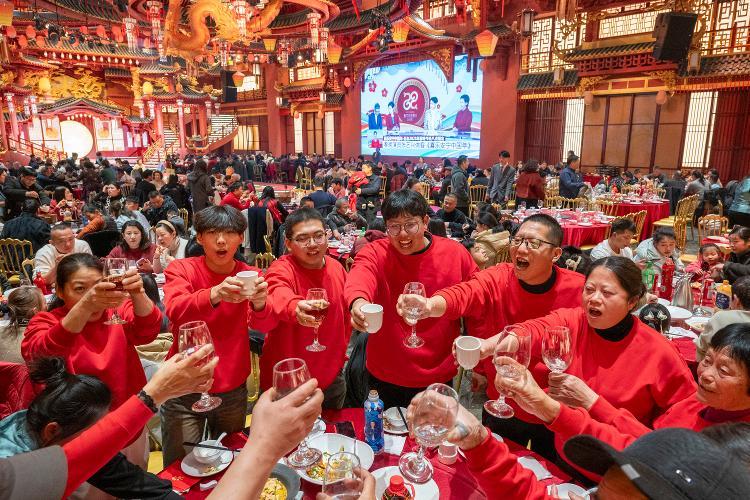 1月28日,人们在安徽省芜湖市繁昌区一家酒店内享用团圆饭。新华社发(肖本祥摄)