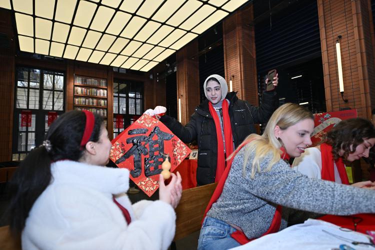 1月26日,留学生在天津意式风情区钟书阁书店展示福字。 新华社记者 孙凡越 摄