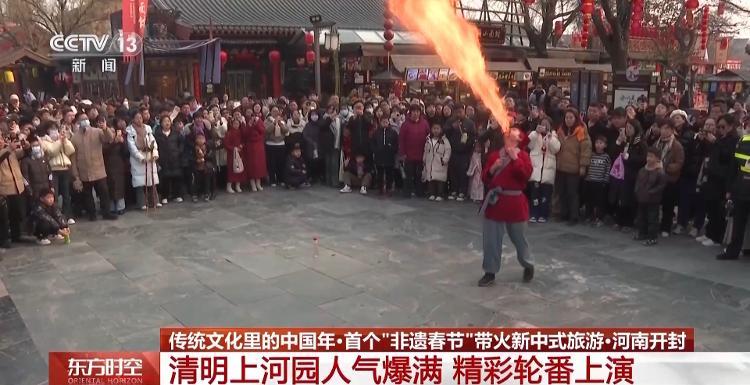 总台记者 田萌:我们现在所在的清明上河园就是按千古名画《清明上河图》打造而成的一个宋文化主题公园。工作人员告诉我们,春节期间,这几天园区的接待量都保持在高位。现场我们看到的是绝活表演——喷火,师傅的动作非常轻松自如,但瞬间能喷出来两到三米长的火龙,人群里都在惊呼和鼓掌。舞龙的队伍腾挪辗转,传说中龙可以行云布雨,大家通过这样的演绎,祈求来年风调雨顺,五谷丰登。再往这条街上看,整个一条街都是非遗展示,面人、糖画、汴绣、糖人还有宋式点茶等,今年是蛇年,工作人员在茶汤上都拉出了小蛇的图案,祝愿大家巳巳如意,生生不息。