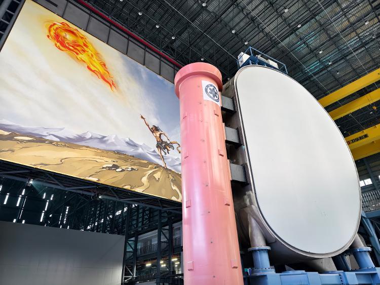 在11号厂房,墙壁上高达十几米的夸父逐日画像,衬托着一座形似“橘子瓣”的巨大腔体,让科技蓝为主色调的空间里有了活跃的神韵。未来,八个这样的“橘子瓣”合而为一,下一代“人造太阳”将在里头进行“燃烧”实验。