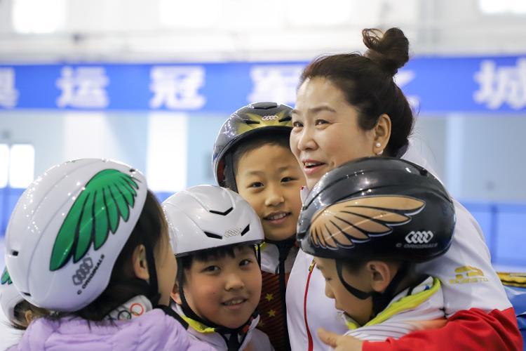 2023年2月7日,赵小兵(右二)在七台河体育中心与小学员们抱在一起。新华社记者 戴锦镕 摄