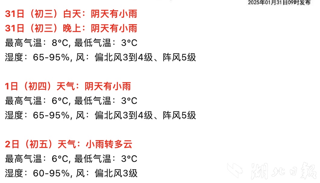 湖北日报讯(记者汤炜玮、通讯员陈声超)1月31日从武汉市气象局获悉,受高空低槽和地面冷空气共同影响,阴雨天气要持续到2月2日,也就是大年初五。武汉市气象局提示大家,出门拜年注意防寒保暖,雨天行车须防范路面湿滑、注意车距、谨慎驾驶,能见度不佳情况下,及时开启雾灯等行车灯光。