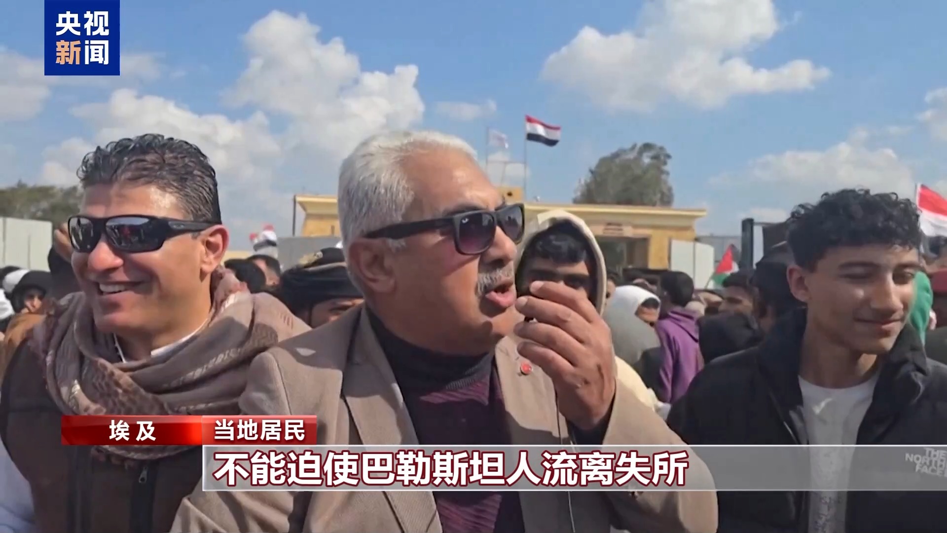 当地居民:在这个地方,在埃及的东部边界,我们宣布始终支持塞西总统的抗争,不能迫使巴勒斯坦人流离失所,也不能以埃及人民为代价解决巴以冲突。