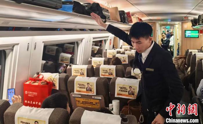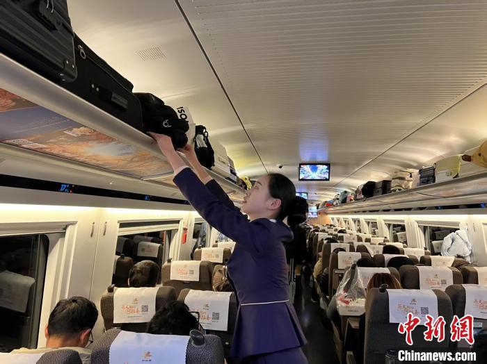 7时15分,列车从上海虹桥车站缓缓驶出。陈晶晶来到车厢忙碌起来。她摆放着车门口的行李,让它们既不挡路又能有序摆放。“这不光是个力气活,还是个技术活。”只见陈晶晶几下摆弄,原本外溢到通道的行李很快被摞到一起。