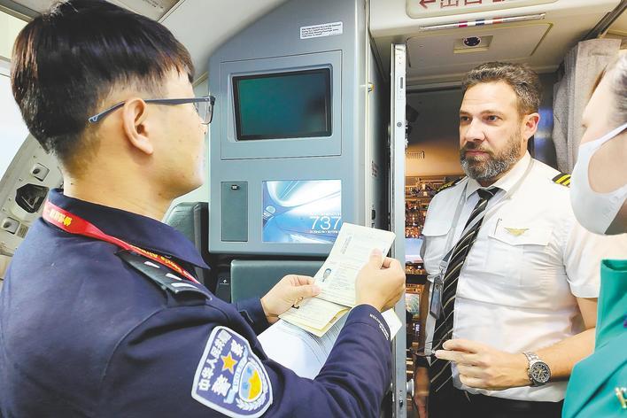 执勤民警在宜昌三峡国际机场检查机组人员。 (湖北日报通讯员 钟鹏宇 摄)