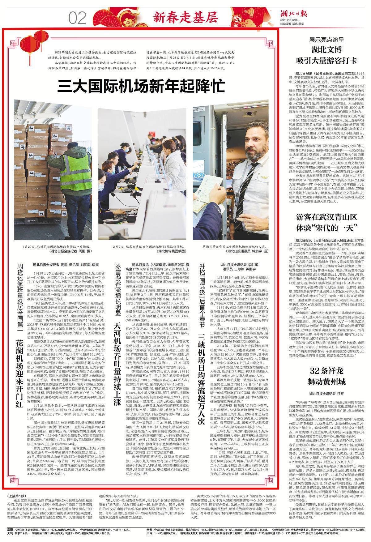 春节期间,湖北日报全媒记者探访湖北省三大国际机场。作为世界第四座、亚洲第一座的专业货运机场,鄂州花湖国际机场在节前一周,以单周货运航班量926班跃居全国第一;武汉天河国际机场从1月28日至2月1日,旅客吞吐量和航班起降量均持续上涨;宜昌三峡国际机场升格“国际级”后,1月28日至2月1日共迎送出入境航班14架次、出入境人员1607人次。