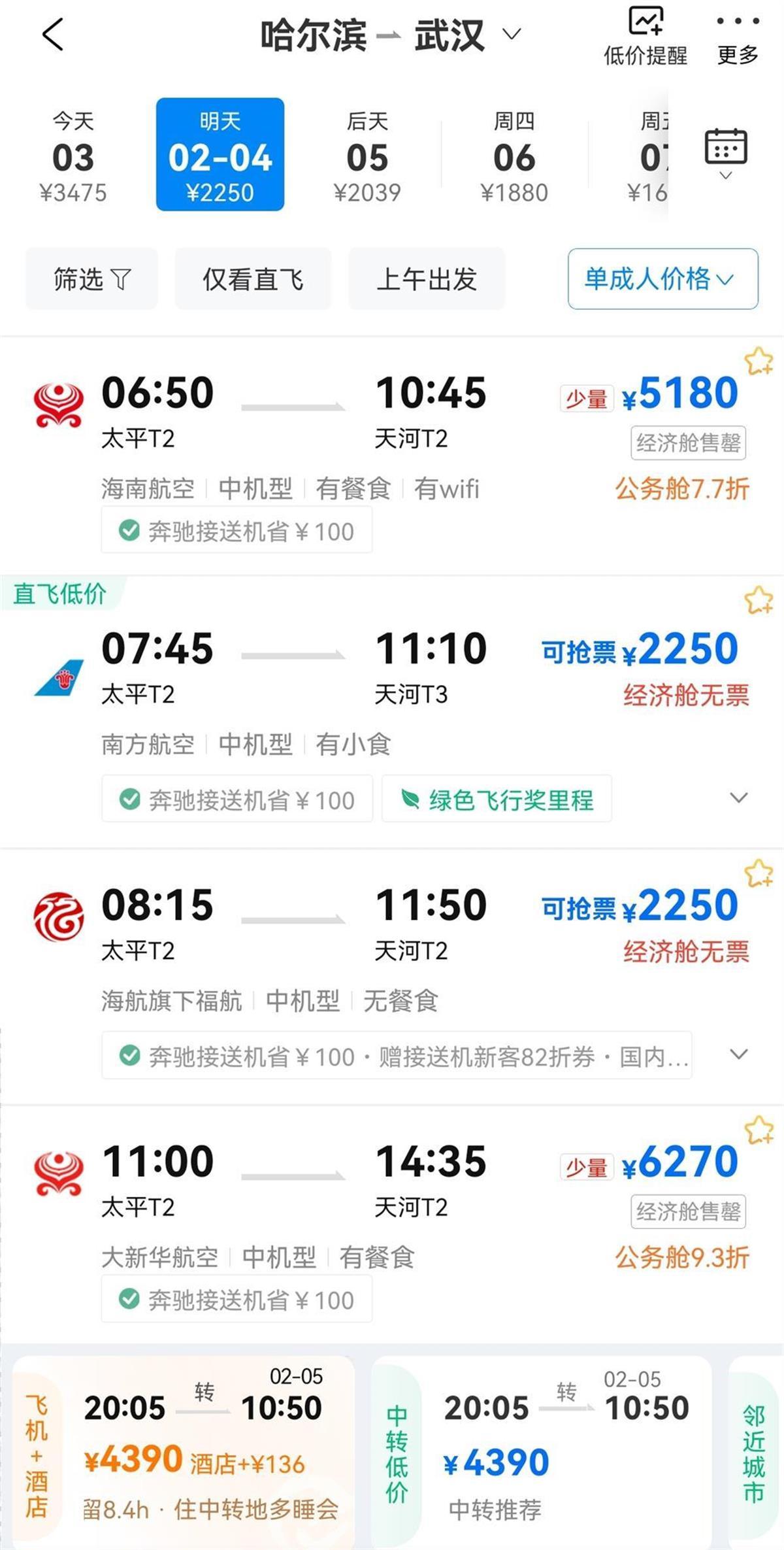 以2月4日武汉到达为例,大连至武汉机票折扣最低8折,裸票价1300元;哈尔滨至武汉不少航班已无经济舱余票,公务舱票价为5180元;沈阳至武汉机票折扣最低9.6折,裸票价为1740元;成都至武汉机票折扣最低5.3折,裸票价850元;重庆至武汉机票折扣最低6.4折,裸票价1040元;昆明至武汉有6.5折机票,裸票价为1170元;三亚至武汉仅剩少量经济舱全价票,裸票价为2230元;丽江至武汉裸票价最低1800元;2月5日北海直飞武汉已无经济舱机票,可预约抢票990元起。