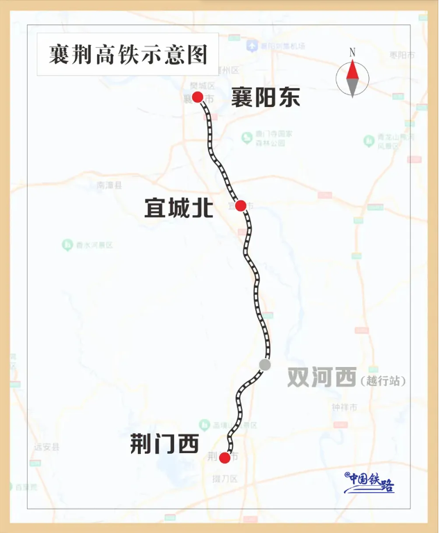 全长118千米的襄(阳)荆(门)高铁,又称呼(和浩特)南(宁)高铁襄荆段,于2022年9月28日开工建设,预计2025年建成。襄荆高铁建成后,乘坐高铁从襄阳至荆门,只需30分钟。荆门西站与荆荆高铁相连,届时,襄阳至荆州有望从目前近4小时压缩至1小时,可实现宜荆荆都市圈与襄阳都市圈快连快通。