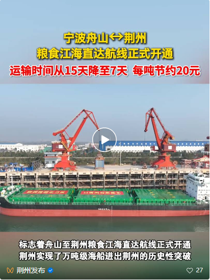 “荆成长江班列”稳定运行、“舟山-荆州”江海直达航线正式开通,实现万吨级海船进出荆州的历史性突破;