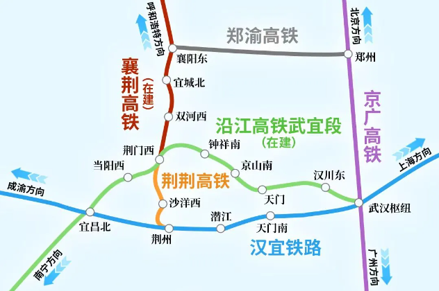 同时,呼南高铁是中国“八纵八横”高速铁路网的重要“一纵”,呈南北走向,为中国中西部地区的干线铁路之一。襄荆高铁通车后,经荆荆高铁北上,荆州可直达北方地区。