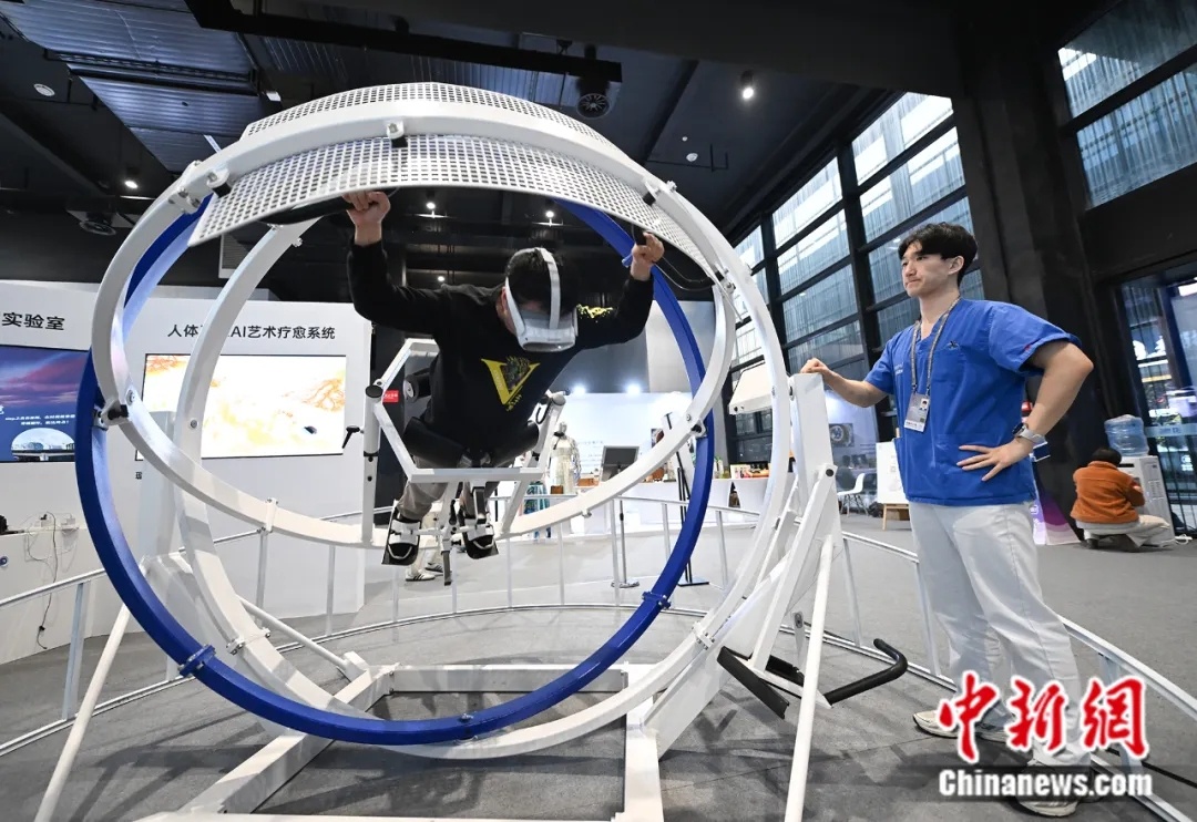 2024年11月21日,浙江乌镇,参观者在2024年世界互联网大会“互联网之光”博览会上体验融合AIGC的万向体感艺术疗愈系统。中新社记者 王刚 摄