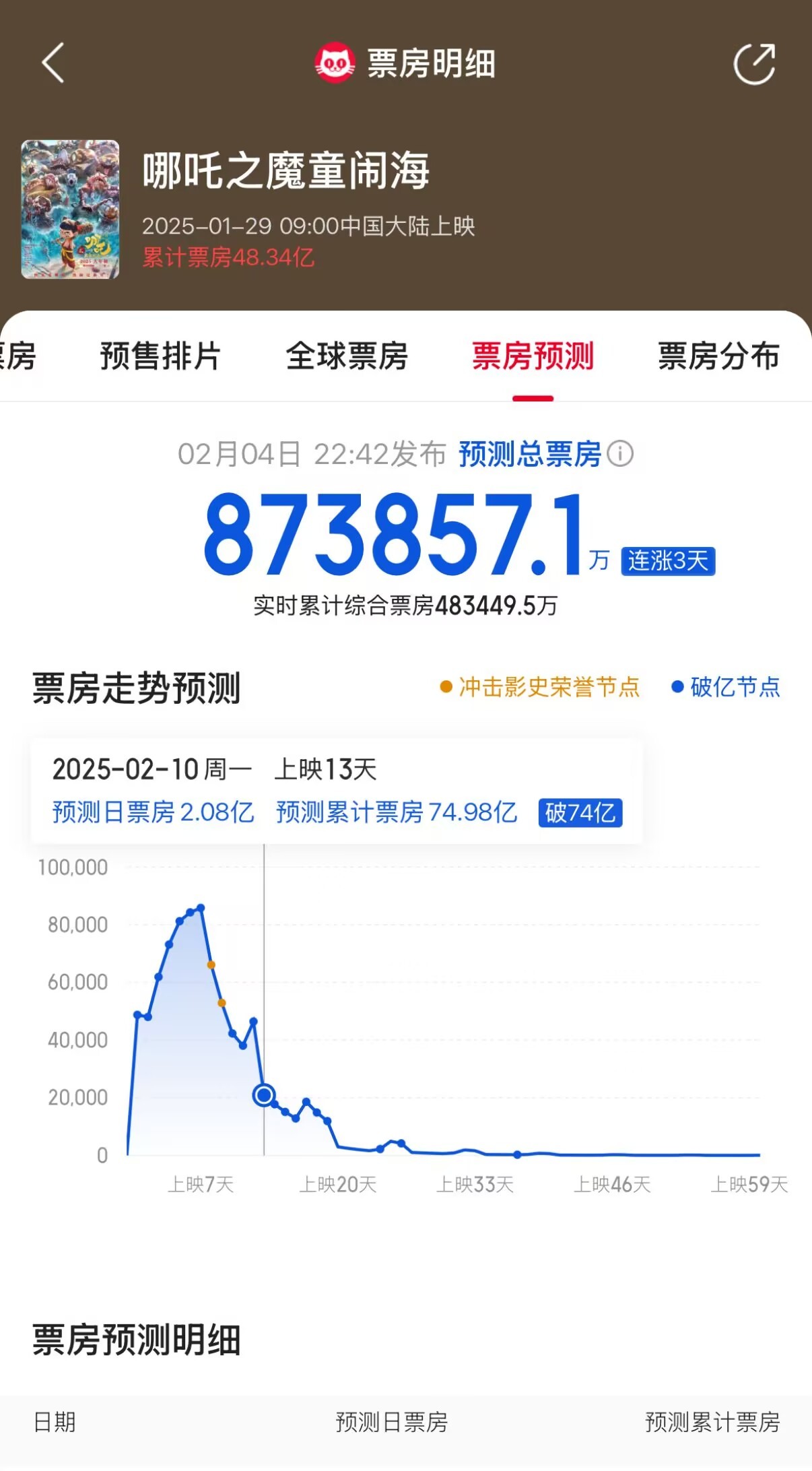 2月4日晚11时许,由于《哪吒2》的票房增速太猛,大数据预测其总票房将达到惊人的87亿,取代2021年上映的《长津湖》,成为中国影史票房第一名。