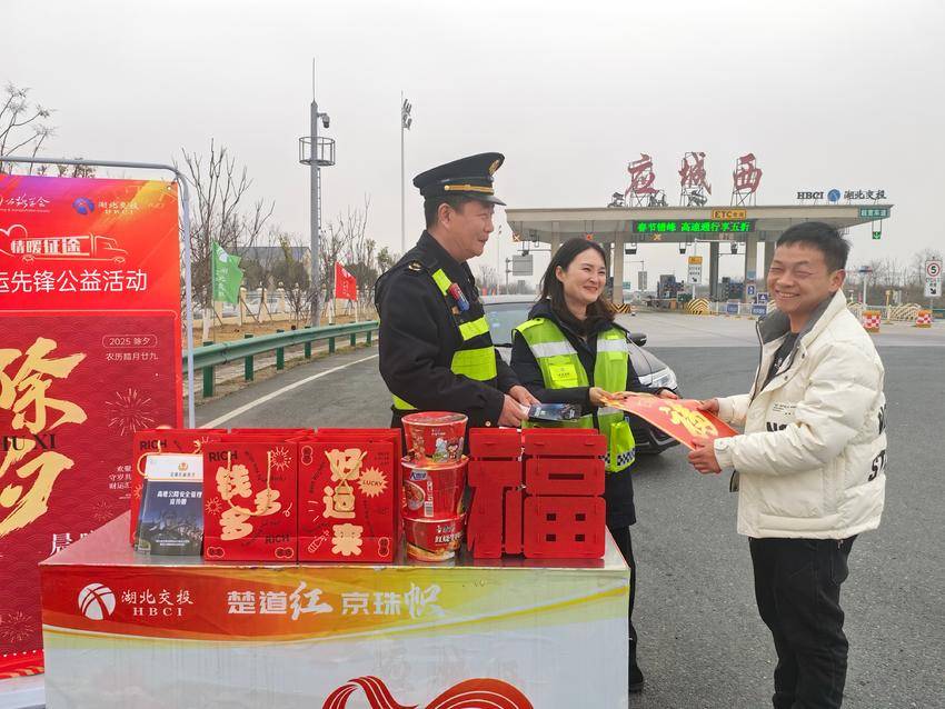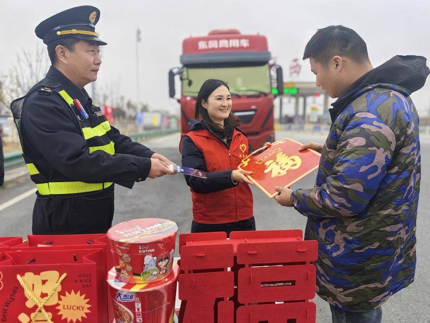 在应城西管理所的收费广场,“晨曦”志愿者们手捧对联和爱心福袋,面带微笑地将这份心意递送到每一位货运司机的手中。司机们接过这份心意,脸上洋溢着幸福的笑容,纷纷表示感谢。更令司机们惊喜的是,福袋中还装有工作人员亲手书写的祝福语红包,此外,“24小时工会驿站”为货运司机提供了更多的暖心服务,进一步擦亮了“微笑京珠”的服务品牌。