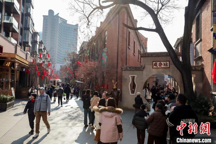 2月4日,游客在汉口咸安坊游玩。当日,春节假期迎来最后一日,武汉江汉路步行街和汉口历史风貌区游人如织,民众游兴不减。中新社记者 张畅 摄