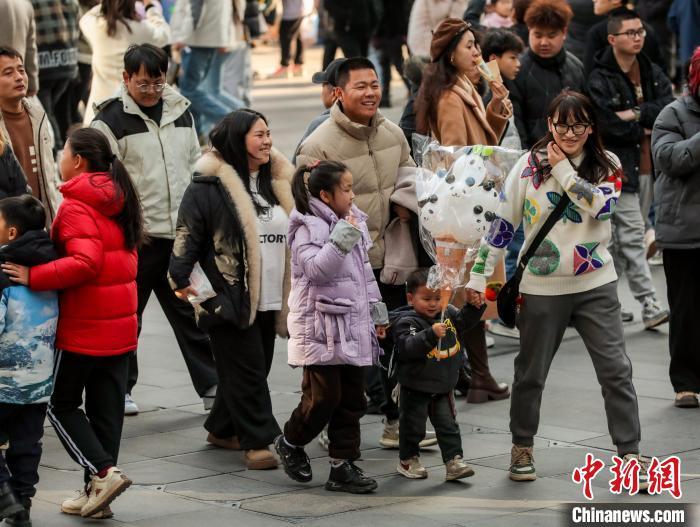 2月4日,游客在江汉路步行街上游玩。当日,春节假期迎来最后一日,武汉江汉路步行街和汉口历史风貌区游人如织,民众游兴不减。中新社记者 张畅 摄