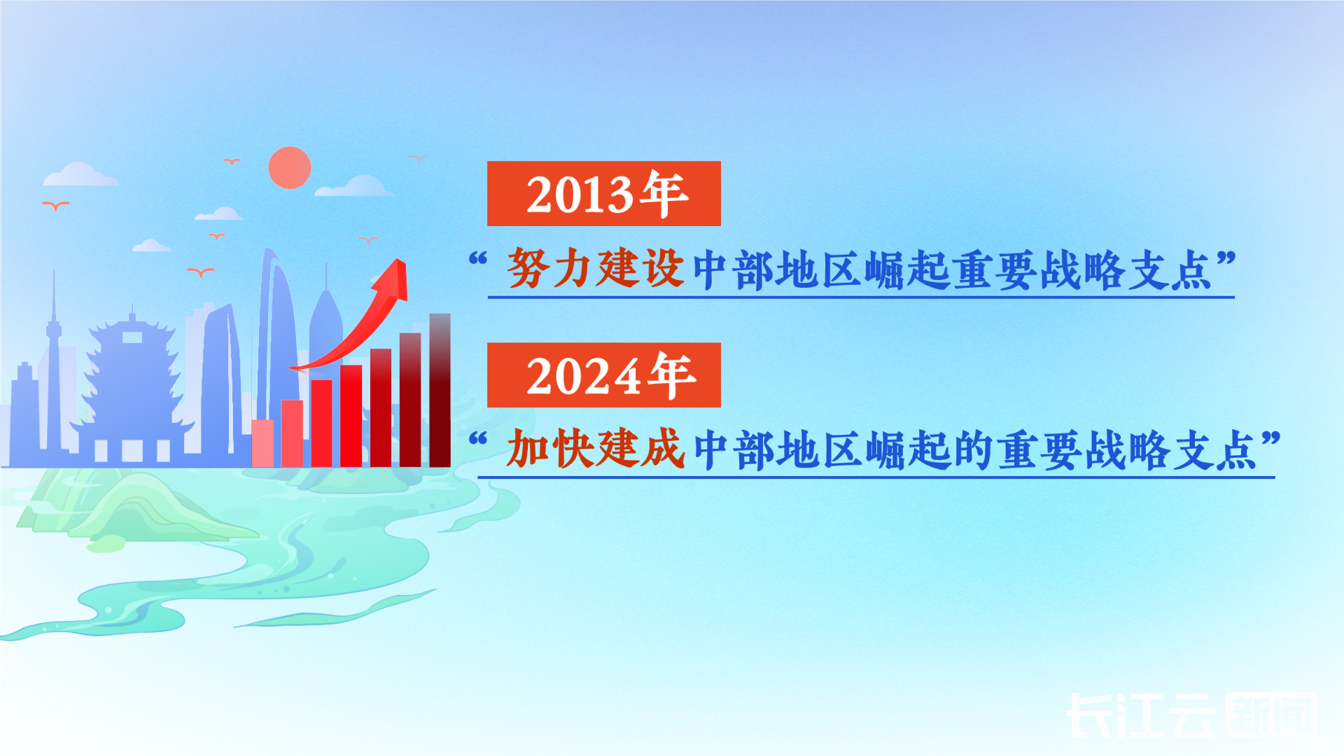 习近平总书记2013年7月视察湖北时,要求湖北“努力建设中部地区崛起重要战略支点”,2024年11月视察湖北时,又赋予湖北“加快建成中部地区崛起的重要战略支点”使命任务,从“努力建设”到“加快建成”,不仅仅是表述变化,更重要的是从“殷切期待”变成“现实任务”。