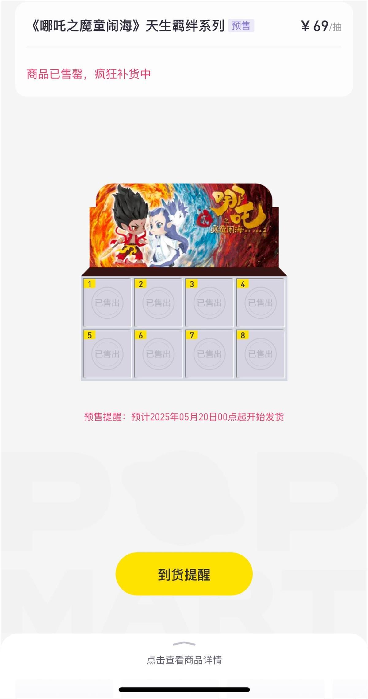 极目新闻记者注意到,在泡泡玛特某平台旗舰店,销售页面显示,《哪吒之魔童闹海》天生羁绊系列手办盲盒销量已超3万,但目前链接已下架。店铺客服表示,这款盲盒手办目前已经售完无货,暂未收到具体的补货时间。泡泡玛特官方app则显示,“商品已售罄,疯狂补货中。”泡泡玛特官方app中还有相关预售提醒:预计2025年5月20日00点起开始发货。