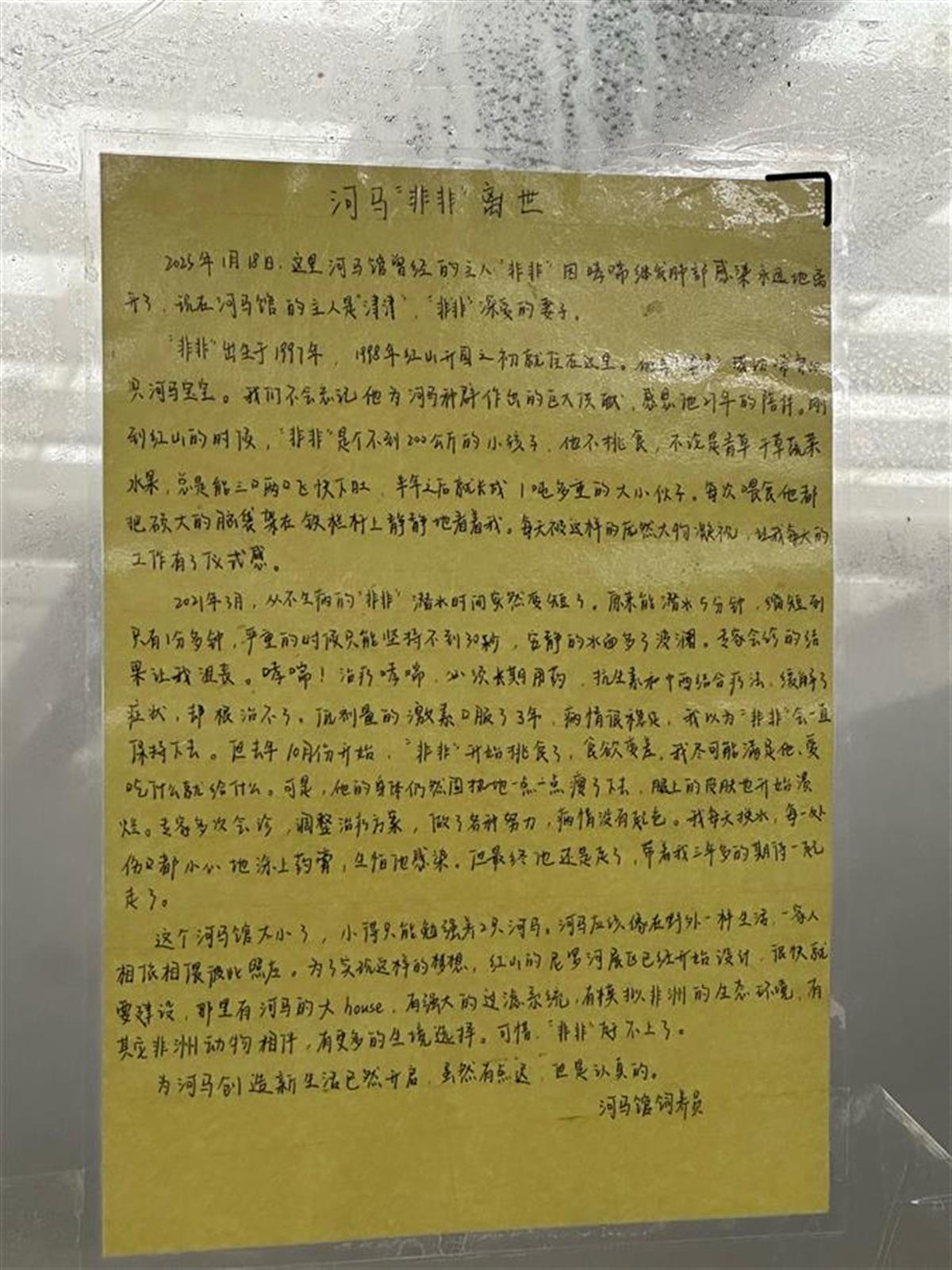 讣闻中写道,河马“非非”生于1997年,自从1998年红山动物园开园之初就在动物园中,与河马“津津”成功哺育了10只河马宝宝。“非非”于2021年3月被确诊为哮喘病,尽管园方组织专家多次会诊,做了各种努力,病情仍不见起色。2025年1月18日,“非非”因哮喘继发肺部感染离世。讣告还提到,河马应该像在野外一样生活,一家人相依相偎彼此照应,为了实现这样的梦想,该园的尼罗河展区已经开始设计,很快就要建设。