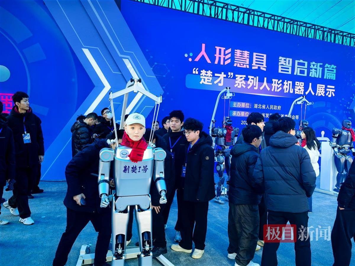 当天,身高约170cm、体重约65kg,全身超过40个自由度的“荆楚1号”机器人同样引人注目——它有一个仿生类人头部,做出“微笑”“悲伤”“惊讶”等表情,毫不费力。