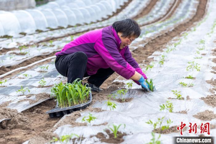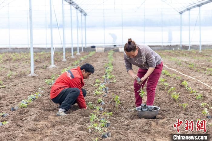 图为当地村民在中坝岛标准化蔬菜大棚里栽种玉米苗。刘纪湄 摄