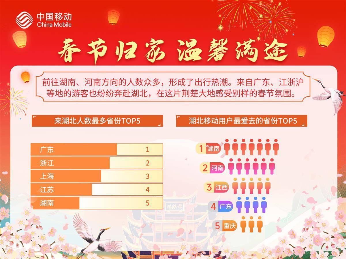 省内游客出行方面,春节期间,返乡探亲和休闲度假需求叠加,共有449.7万移动用户离开湖北,1月30日为出游高峰,出行天数3天及以上的人群超五成,他们主要前往湖南、河南、江西、广东等地。湖北省出境移动用户数为1.6万人次,泰国、新加坡是热门目的地。