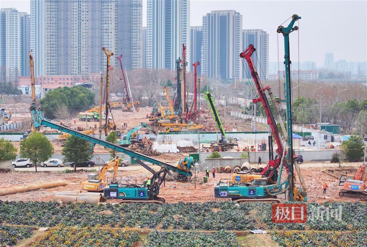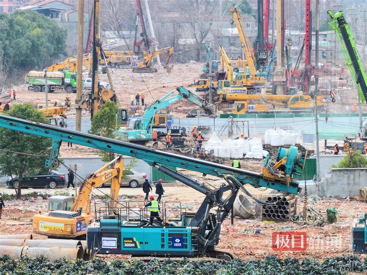 2月5日,位于武汉市洪山区南李路的武汉地铁12号线板桥停车场建设工地一派忙碌景象:工程人员正操纵挖掘机、旋挖钻机和起重机等大型机械设备同步作业。