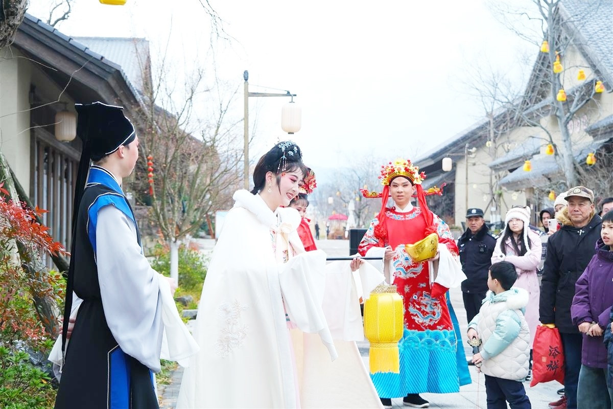 2月3日是农历正月初六,上午10时,湖北省黄梅县问梅村巡游演出开始,几名英俊帅气的青年演员身着鲜艳古装,手拿元宝、黄灯笼等祥瑞物,扮成财神、月老与状元,从唐宋建筑风格的店铺经过,边走边向游客们发礼物。武汉游客张先生惊呼:“难道我穿越了?这群年轻人,简直不要太漂亮。”
